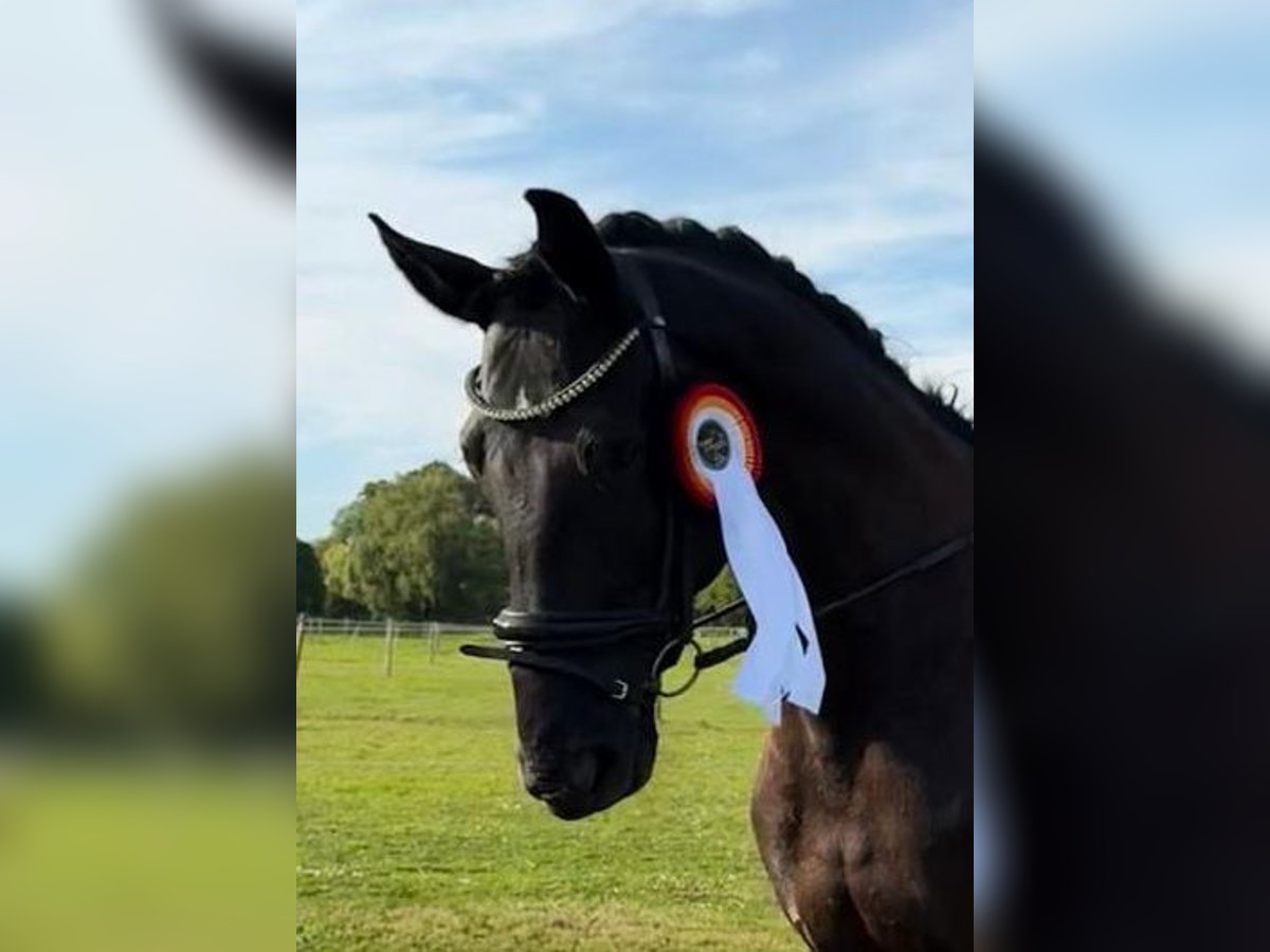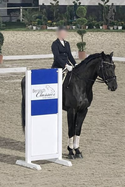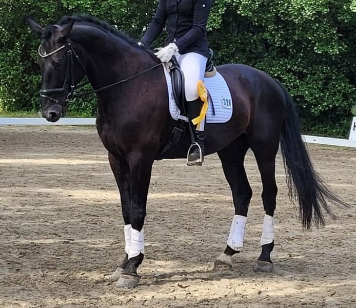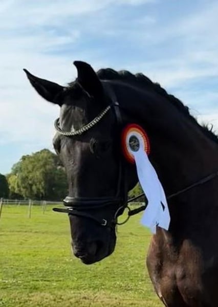 Zum Verkauf steht ein sehr schicker Rappe mit imposanter Erscheinung und tollem Charakter. Er ist fein zu reiten, angenehm an den Hilfen und dabei im täglichen Umgang absolut unkompliziert. Er ist super brav, schmiedefromm und lässt sich problemlos verladen. Auf Turnieren war er sowohl im Springen als auch in der Dressur erfolgreich unterwegs und macht seinen Job dort souverän. Besonders angenehm: Auch wenn er mal ein paar Tage nicht geritten wird, ist er direkt wieder voll da und weiterhin brav. Mit anderen Pferden ist er gut verträglich und insgesamt ein unkomplizierter Partner für viele Bereiche. Der Verkauf erfolgt ausschließlich wegen Zeitmangel und eigener Nachzucht – wir können leider nicht alle Pferde behalten. Direkt vom Züchter. Ein schickes, zuverlässiges Allroundpferd für Freizeit und/oder Turnier.