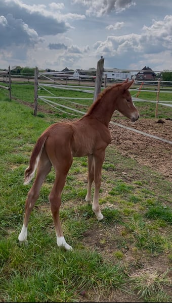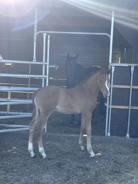 Unfortunately, we cannot raise stallions here, so we are looking for a 5* home for our Night Agent starting at the end of September. Father: Next Golden Champion MF (147cm) (Next Diamond x Golden Wesr) Mother: Sandro Hit x Brentano 2 (170cm) He is already very tall and will definitely exceed 160cm. Current height is 140cm. Registered as a German Riding Pony. Full papers, approved for breeding in the Rhineland. The mother is a performance mare and was herself successful up to the advanced class. The father is highly successful in riding horse tests with scores between 8-9.0! Character 10.0, a foal to fall in love with for sport or as a high-quality leisure partner. Absolutely place before price! He deserves to have a 5* home because he simply does everything right :) Can move out immediately, born mid-April.