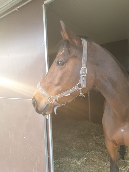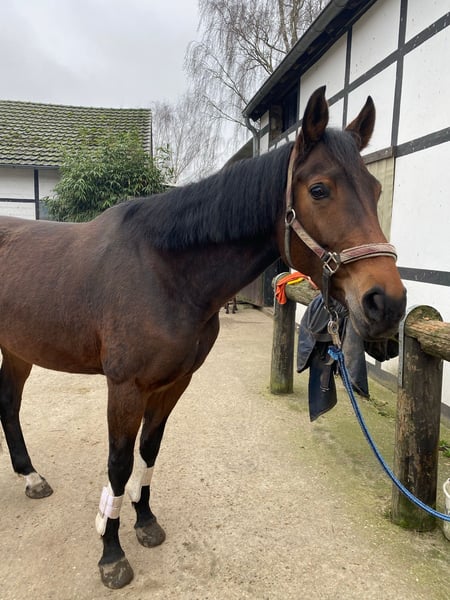 I would like to find a loving home for my 12-year-old Rhinelander mare named Roxy. I bought Roxy directly from the breeder in 2020. We have experienced a lot together, and now I hope to find someone who will cherish her as much as I have. Roxy is a horse with great basic gaits and a strong motivation to work with her rider. She has a healthy go—bucking, rearing, or running off are not her things. By the way, she is also very affectionate! In dressage, she has been trained up to level A, and she has already jumped A courses with the breeder. However, this has not been pursued further. Roxy prefers to go out in the field with a horse buddy, confidently leading the way and always showing reliability. Otherwise, we have tried a lot together: dressage, free jumping, groundwork, circus lessons, walking, and pole work. Roxy enjoys being in a herd and as much time outside as possible—that makes her happy! Under saddle, Roxy likes clear guidance—so she is not a pure beginner's horse. She is well-behaved when loading but also needs someone who can give her clear leadership. Unfortunately, due to a private accident, I can no longer ride pain-free and therefore wish for a loving forever home for Roxy. A few specifics: Roxy is currently with my trainer (Ricarda Bukowski) and is being worked with and ridden here. She has an equine sarcoid on her chest, which the veterinarian has described as a "cosmetic flaw"—it does not bother her and does not spread! In 2023, Roxy had a screw placed in her fetlock due to a cyst. This has been closely monitored by a veterinarian and is no longer a problem when riding or in everyday life. For these reasons, Roxy is being sold well below her value—but please only as a loyal leisure companion, as she is no longer suited for competition. I also do not want to sell Roxy solely as a show jumping horse, as she loves dressage and shows a lot of potential here! Roxy is not an emergency sale! She is only to be given to loving hands! Home before price! Equipment can be purchased for an additional fee (dressage saddle, bridle, etc.). Please inquire only if you are genuinely interested in Ricarda Bukowski (+49 1522 9390133).