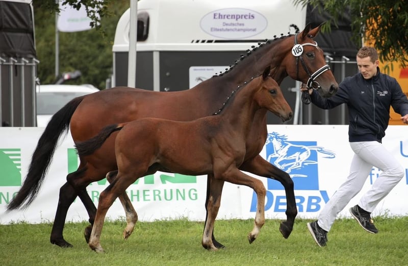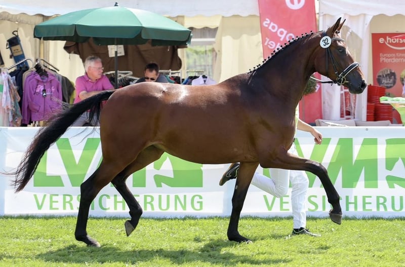 For sale is a successful breeding mare by Sir Donnerhall x Rubiloh. She is in foal to Security (Station Beckmann; winner of the 50-day test with a score of 9.01; pedigree Secret x Ampere x Jazz). The mare is a Hanoverian premium mare. She won her mare registration and was entered into the Hanoverian association with top scores (overall score 8, swing 9, walk 8…). She has achieved an above-average mare performance test (trot 8.5, canter 8, rideability judges and outside riders 8). The full brother of the mare was licensed in Munich Riem and received a premium. He is now placed in dressage up to class S. A half-brother of the mare is a series winner in S-level dressage competitions. From the direct maternal line, there are numerous successful horses. All of the mare's previous foals have impressed with their type and movement quality. A foal by For Romance placed 3rd in the final of the German foal championship in Lienen among dressage-focused colt foals. He is now successfully competing in Canada. The mare is healthy and without impairments. She is well-behaved in handling. She foals without complications, takes good care of her foals, and is a caring mother. She is being sold only due to existing offspring. Further information available upon request.