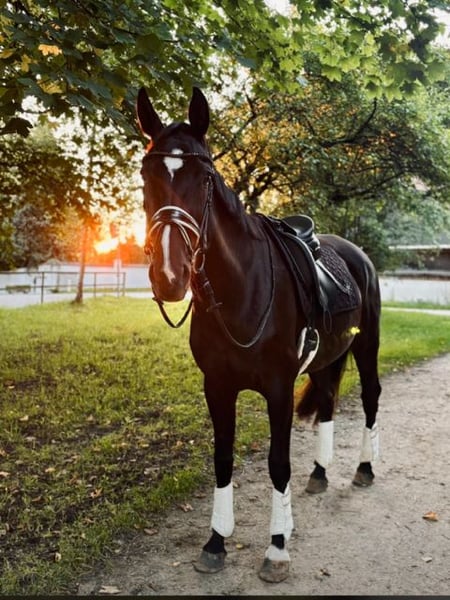 Nach 8 gemeinsamen schönen Jahren suche ich für meine Stute einen neuen Platz auf Lebenszeit. Sie war mein Lehrmeister! Sie beherrscht sämtliche Dressurlektionen von Seitengängen, Traversalen, Außengalopp, fliegende Wechsel etc. Bei uns bestand jede Woche Abwechslung - von Ausreiten, Springen, Dressur etc. Vom Typ her ist sie gehfreudig und stets motiviert zu arbeiten. Unarten wie bocken, steigen u.s.w. kennt sie nicht. Ich selbst habe zwei Kinder, die mit ihr gemeinsam groß geworden sind, nicht reiterlich, aber im Umgang. Hier ist sie absolut vertrauensvoll und man muss nie Angst haben. Turniere sind wir nur wenig gegangen - ein paar A-Dressuren und vereinzelt E-Springen, da bei mir hierfür keine Zeit war. Sie stand viele Jahre in einer Box mit täglichem Weidegang. Seit einigen Jahren ist sie im Offenstall. Hier ist sie eher ranghoch, aber sehr kooperativ und nett zu anderen. Krank war sie in der Zeit nie groß.