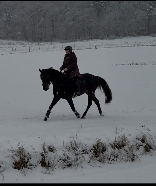 Directly from the breeder, Elli is looking for a new, loving home. Elli is a 4-year-old mare by Eckhardt x Granikos x Sherwood. Not only is Elli beautiful, but she is also absolutely rideable and clear-minded, with three very good gaits. She impresses with her rhythm and work ethic. Elli was started under saddle at the end of her 3-year-old year and has been out on the trails three times. After spending the spring in the pasture, she is now slowly being introduced to dressage work, making her ready for further training. She also shows talent over jumps, so nothing stands in the way of a versatile education. Elli goes out calmly in a group and alone in all gaits. Children, dogs, tractors, sheep, cows, etc. are absolutely normal for her. She has grown up in a herd environment with us and is well socialized. She is still growing at the moment. Mare, 4 years old 160 cm Eckhardt x Granikos x Sherwood ‼️ For serious inquiries, please call 0171/8353415‼️