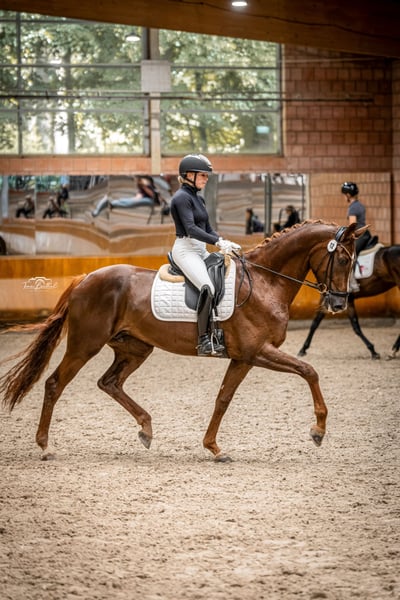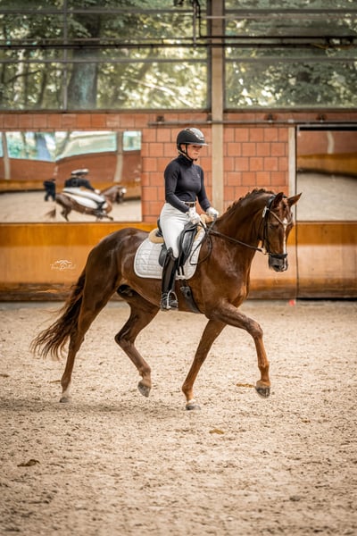 Diese außergewöhnlich charmante Stute aus eigener Zucht überzeugt durch ihren traumhaft schönen Stutentyp, viel Ausstrahlung und enormes Potenzial für den Dressursport. Sie ist jung und unverbraucht: dreijährig schonend angeritten, anschließend tragend gewesen und Mutter eines überragenden Hengstfohlens von Glamourdale. Ende vierjährig wurde sie wieder aufgenommen und seither behutsam und altersgerecht weiter ausgebildet. Die Stute zeigt sich sehr sensibel, aufmerksam und mit einem ausgeprägten Willen, alles richtig zu machen. Fünfjährig absolvierte sie ihre Stutenleistungsprüfung mit 8er-Noten, was ihr Talent und ihre Rittigkeit unterstreicht. Sie bringt alle Möglichkeiten für das große Viereck mit, benötigt jedoch einen einfühlsamen Menschen, der sie mit Ruhe weiter fördert, ihr Zeit gibt und ihr Vertrauen weiter aufbaut. Unter diesen Voraussetzungen ist sie eine äußerst vielversprechende Partnerin für die Zukunft. Ein Pferd für Liebhaber, Ausbilder und ambitionierte Reiter, die Qualität, Charakter und Perspektive schätzen. AKU mit Röntgenbildern von 2025 liegt vor! Wir schätzen ernsthafte Anfragen und unterstützen KEIN Touristenreiten!