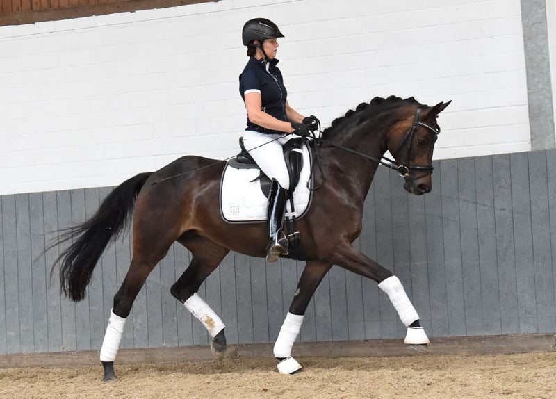 "MARIBELLE" *2017 Mare dark brown. 168 cm Rhinelander v. Morricone - Picture-perfect mare with the very best interior: strong nerves, balanced and relaxed, concentrated and always for the rider. Maribelle moves light-footedly, always to the beat and swinging through the body, Her hind leg naturally works under the center of gravity, she is easy to sit on and always takes the rider well with her. Maribelle already had a foal, has been riding since April 2023 and is owned by the breeder. X-ray good.