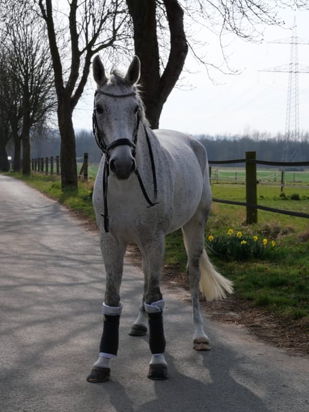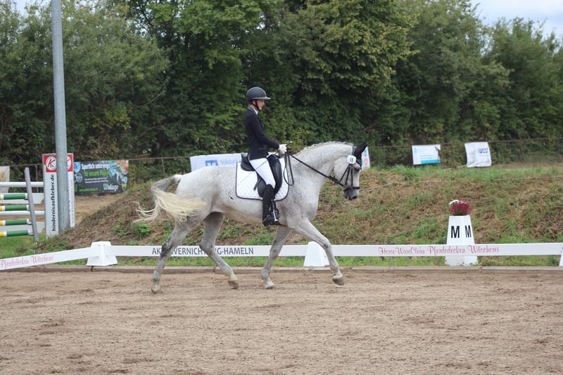 For sale is our mare Caramba. Caramba is 9 years old and is sired by "Come and Fly" x "Raphael". She is looking for a new 5-star home where she will be treated like a princess. She is extremely people-oriented and has a character of gold. Caramba is reliable, good-natured, and has no issues with veterinarians, farriers, or loading. In dressage, she shows a high willingness to learn and a great work ethic. She has placements in A*, A**, and L* (she received a ribbon directly in the second L dressage). In the field, she can go in front, in the middle, or in the back. Unfortunately, Caramba was diagnosed with arthritis at the beginning of the year and is therefore only allowed to jump conditionally. Caramba is a true family horse that enjoys and demands closeness and affection. We wish for Caramba a home where she is not taken to competitions every weekend, but can also just be ridden with a neck ring and loved as she is. Whoever wins her heart will quickly find that she would go through fire for them. She is suitable for beginners and is very careful with children. If you are interested, please feel free to send an email. As long as the ad is online, she is still available; please only send serious inquiries. No installment payments or trade-ins.