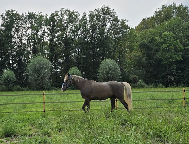 Star’s Silver Heron – Rocky Mountain Horse (RMHA) 7 Jahre alter, großer Rappe mit Silberapfelfarbe Zuchtbuchpapier der Rocky Mountain Horse Association (RMHA) Vater: EFM ROCKIN'ROCKET Farbe: Schwarz Mutter: MVF EASTER PARADE Farbe: Silberapfelschimmel Heron ist ein groß gewachsener, kräftig gebauter Wallach und misst ca. 1,58 m! Sein Charakter ist außergewöhnlich lieb und sanft, menschenbezogen und äußerst treu. Auf der Weide zeigt er alle vier Gänge, im Tölt ist er lateral, mit weiterer Ausbildung besteht viel Potenzial. Sein Vater, EFM Rockin’ Rocket, stammt von der Stute Pretty Woman ab, einer direkten Dock-Tochter, die in Amerika von J. Lee’s Rockit gedeckt wurde. Seine Mutter, MVF Easter Parade, gehört zu den wenigen Pferden in Europa, die die alten Mountain Pleasure Horse-Linien in sich tragen. Easter Parades Mutter, Bourbon Manhattan, ist eine Tochter des Mountain Pleasure Horse-Foundationshengstes Mountain Bourbon sowie der Foundation-Stute Fancy Lady Scarlet. Diese Linien sind in Europa und innerhalb des Rassekreises äußerst selten und sehr nah in der Abstammung verwandt. Heron kennt Bodenarbeit und ist eingeritten. Er hat die Zeit gebraucht, um vollständig heranzuwachsen, weshalb die Ausbildung nun wieder aufgenommen werden sollte. Er arbeitet gern mit und ist sehr lernwillig, er möchte gefallen. Wir suchen für ihn einen Reiter, der mit Gangpferden vertraut ist und ihn weiter ausbilden sowie schöne Ritte machen möchte. Er ist brav beim Hufschmied und wird regelmäßig beschlagen, macht regelmäßig eine jährliche Zahnkontrolle, ist regelmäßig entwurmt, seine Impfungen sind auf dem neuesten Stand, und beim Osteopathen ist er ebenfalls brav. Er kennt das Anhalten, liebt Putzen und Aufmerksamkeit. Er ist leicht auf den Trailer zu laden und läuft stets ordnungsgemäß an der Führleine mit. Heron verträgt keinen Staub, deshalb erhält er bei uns immer Vor-Droog-Hafer oder Heu. Feuchtes Heu kennt er ebenfalls und arbeitet gut damit. Im Frühjahr und Sommer trägt er stets einen Fliegendecke gegen die Insekten. Heron steht bei uns 24/7 draußen auf einer großen Paddock mit großem Unterstand und kommt täglich in die Weide. Das entspricht auch unserer Wunschvorstellung für ihn. Momentan läuft er mit unseren anderen Wallachen und einem Hengst auf der Weide, was problemlos funktioniert. Zuvor hat er auch einige Jahre in einer gemischten Herde mit Stuten verbracht. Der Verkaufspreis für Heron beträgt 12.000 Euro. Möchtest du diesen „großen, intensiven Schatz“, den du immer rufst, wenn er dich sieht oder hört, persönlich kennenlernen oder mehr Informationen erhalten? Dann kontaktiere uns gern über das Kontaktformular oder per E-Mail an jockeylin@planet.nl