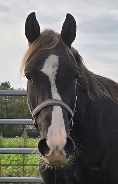 Star’s Silver Heron – Rocky Mountain Horse (RMHA) 7-jarige grote ruin, zilverappel zwart Stamboekpapier Rocky Mountain Horse Association (RMHA) Vader: EFM ROCKIN'ROCKET Kleur: zwart Moeder: MVF EASTER PARADE Kleur: zilverappel zwart Heron is een grote sterk gebouwde ruin en meet ca. 1,58 meter! Zijn karakter is bijzonder lief en zachtaardig, mensgericht en heel trouw. In de wei vertoont hij alle 4 zijn gangen, in de tölt wat lateraal maar met verdere training zit er veel potentie in. Zijn vader, EFM Rockin’ Rocket, is geboren uit de merrie Pretty Woman, een directe Dock-dochter die in Amerika is gedekt door J. Lee’s Rockit, Zijn moeder, MVF Easter Parade, is één van de weinige paarden in Europa die de oude Mountain Pleasure Horse lijnen in zich hebben. Easter Parade haar moeder, Bourbon Manhattan, is een dochter van de Mountain Pleasure Horse foundation hengst Mountain Bourbon, en tevens ook Foundation merrie Fancy Lady Scarlet. Deze lijnen zo dichtbij in de stamboom zijn uniek in Europa en binnen het ras. Hij kent grondwerk en is zadelmak. Hij heeft zijn tijd nodig gehad om helemaal uit te groeien tot het paard dat hij nu is. Daarom zal de training weer opgepakt moeten worden. Hij houdt van samenwerken en is erg werkwillig, hij wil graag pleasen. Wij zoeken voor hem een ruiter die bekend is met gangenpaarden en hem verder wil opleiden en mooie ritten zal gaan maken. Hij is braaf bij de hoefsmid en wordt regelmatig bekapt, jaarlijkse tandartscontrole doet hij braaf, hij wordt regelmatig ontwormd, entingen zijn op orde, bij de osteopaat is hij ook braaf. Hij kent vaststaan, houdt van poetsbeurten en aandacht. Hij is makkelijk op de trailer, loopt altijd keurig mee aan het halstertouw. Heron kan niet tegen stof, daarom krijgt hij bij ons altijd voordroog hooi/kuil. Nat hooi kent hij ook en werkt ook goed. In het voorjaar/zomerseizoen draagt hij altijd een vliegendeken tegen de insecten. Heron staat bij ons 24/7 buiten op een grote paddock met grote overkapping, en komt ook dagelijks in de wei. Dit is ook wat wij voor hem zoeken. Hij loopt momenteel met onze andere ruinen en een hengst in de wei en dat gaat helemaal prima. Voorheen heeft hij ook een paar jaar in een gemengde kudde gelopen met merries erbij. Vraagprijs voor Heron is 12.000,- euro. Wil je deze “grote intense lieverd” die je altijd roept als hij je ziet of hoort met eigen ogen komen bewonderen of meer informatie? Neem dan contact met ons op via het contactformulier of email jockeylin@planet.nl