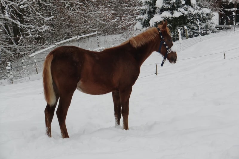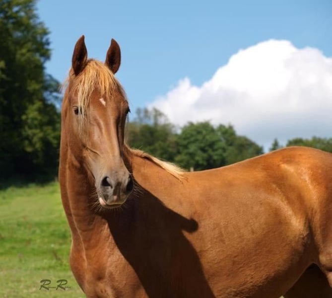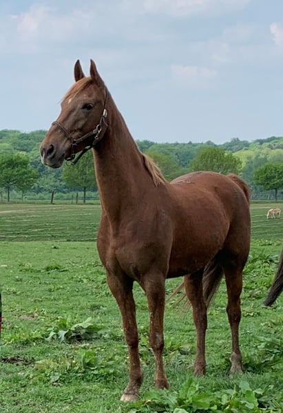 Im Auftrag Zum Verkauf steht die charmante American Saddlebred Stute Harlem’s Shirin Soulqueen. Wie der Name schon sagt, stammt Sie aus der Familie der Harlem‘s. Stammbaum wurde aber nie beantragt und auch nicht eingetragen. Shirin ist 15 Jahre alt (geb. Juni 2010), Fuchs, und hat ein Stockmaß von ca. 1,55 m. Sie ist eine absolut geländesichere Stute, da sie ausschließlich im Gelände geritten wurde. Sie geht alleine, wie auch in der Gruppe ins Gelände. Dabei zeigt sie sich stets brav, zuverlässig und nervenstark. Eine tolle Partnerin für entspannte Ausritte und Reiter, die Wert auf Vertrauen und Ruhe legen. Sie wird gebisslos geritten (Gebiss kennt Sie nicht). Shirin kennt Straßenverkehr (Autos und Traktoren/Weidemann) und kennt jegliche Art von Tieren (Hunde, Katzen, Schafe, Ziegen, Hühner und Kühe, nur schwarz/weiße Kühe sind gruselig) Im Umgang ist sie brav, aber hibbelig. Angebunden sein mag Sie nicht so gerne, da kann es vorkommen, dass Sie auch mal geht. Der ein oder andere Strick musste schon drunter leiden. Anhänger fahren, mag Sie auch nicht so gerne. Shirin besitzt einen Equidenpass. Sie ist regelmäßig alle 8 Wochen beim Schmied, regelmäßig geimpft (Tetanus und Influenza) und entwurmt (3-4x im Jahr). Shirin war bis dato immer kerngesund. Sie steht im Winter von morgens bis abends auf einer großen Wiese (mit Heu) und nachts in der Box. Im Sommer steht Sie 24 Stunden auf der Wiese. Shirin ist kein Anfänger-Pferd!!! Shirin wird inklusive komplettem Zubehör abgegeben (Sattel, Zaumzeug, Decke,…) Bei Interesse oder weiteren Fragen gerne melden Ein Probereiten ist nach Absprache möglich. Shirin steht in einem Stall in Düsseldorf-Knittkuhl.