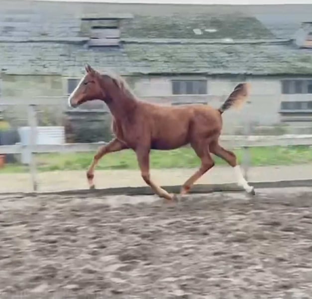 te koop aangeboden: veelbelovende vosse hengst, geboren in 2025, uit de sterke en bewezen combinatie Bonds x Escuro, rechtstreeks uit de gerenommeerde stam van Rosantica, de volle broer van de moeder liep GP in USA en de grootmoeder liep ook internat GP. Als veulen was hij al een plaatje, wat zijn kwaliteit in model, beweging en genetische aanleg onderstreept. Hij combineert een modern type met een correct fundament en een sterke bovenlijn. In beweging toont hij veel souplesse, kracht en elasticiteit, met een natuurlijke balans Qua karakter is hij gemakkelijk en mensgericht, groeit op in kuddeverband en is reeds trailergewenst, wat hem praktisch en ongecompliceerd maakt in de omgang.