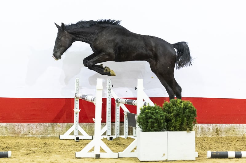 In his first loose jumps he already shows plenty of scope. What stands out immediately is his exceptional hind leg technique. He is eager to do his best and jumps with commitment and conviction. He moves easily, with an active hind leg and a good, big canter stride. Light-footed for his size and naturally well balanced. A young horse with power, attitude and serious future potential.