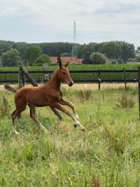 Charlie Ter Fosse ist ein vielversprechendes Hengstfohlen aus Vivana Ter Fosse (v. Orleans van de Kruishoeve) und Pedro Sitte (Quabri de L’Isle). Diese Kombination vereint einige der einflussreichsten Springlinien der Gegenwart. Pedro Sitte ist ein junger, vielversprechender Hengst und Sohn des Olympioniken Quabri de L’Isle. Seine Mutterlinie ist ebenso stark: Katona Sitte ist eine Tochter von Old Chap Tame (v. Carthago), der selbst auf höchstem Niveau aktiv war und die Nations Cup in Aachen gewonnen hat. Über die Großmutter Estrella Sitte (v. Ogano Sitte) führt die Linie direkt zurück auf Ustina Sitte (v. Clinton), die international erfolgreich mit Olivier und Nicola Philippaerts war. Die berühmte Sitte-Linie hat zudem zahlreiche Grand Prix-Pferde hervorgebracht, darunter Dayton, Baltik, Exotik und Button Sitte. Die Mutter Vivana Ter Fosse stammt von Orleans van de Kruishoeve ab, der selbst auf 1,55 m-Niveau mit Reitern wie Neri Pieraccini, Thibault Philippaerts und Robin Van Thillo erfolgreich war. Orleans ist ein Sohn von Fantomas de Muze und Jeanne d’Arc van de Kruishoeve, die wiederum von Vagabond de la Pomme abstammt. Diese Linie hat sich international als erfolgreich erwiesen, mit Nachkommen, die auf 1,60 m-Niveau Leistungen zeigen. Vivana stammt aus einer Linie mit klaren schwedischen Warmblut-Einflüssen über Caiza (v. Brabant) und Kalla (v. Lansiar). Diese Zuchtlinie hat mehrere Sportpferde hervorgebracht und ist bekannt für Temperament, Nützlichkeit und Reitbarkeit. Vivana kombiniert somit die Sportqualitäten der skandinavischen Zucht mit dem modernen Springtyp aus der belgischen und niederländischen Zucht. Mit diesem Hintergrund verfügt Charlie Ter Fosse über moderne Springgene, bewährte Sportleistungen und eine Stutenlinie, die ihren Wert in Belgien, den Niederlanden, Deutschland und Schweden unter Beweis gestellt hat. Eine Investition mit Sicherheit sowohl im Sport als auch in der Zucht. *Der Pass wurde beantragt und befindet sich noch in Bearbeitung beim Zuchtverband, bitte rechnen Sie mit möglichen Verzögerungen.