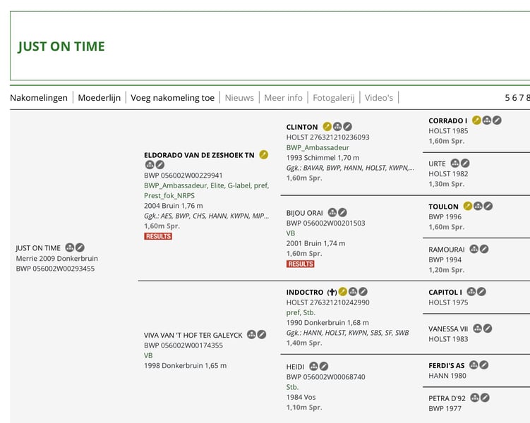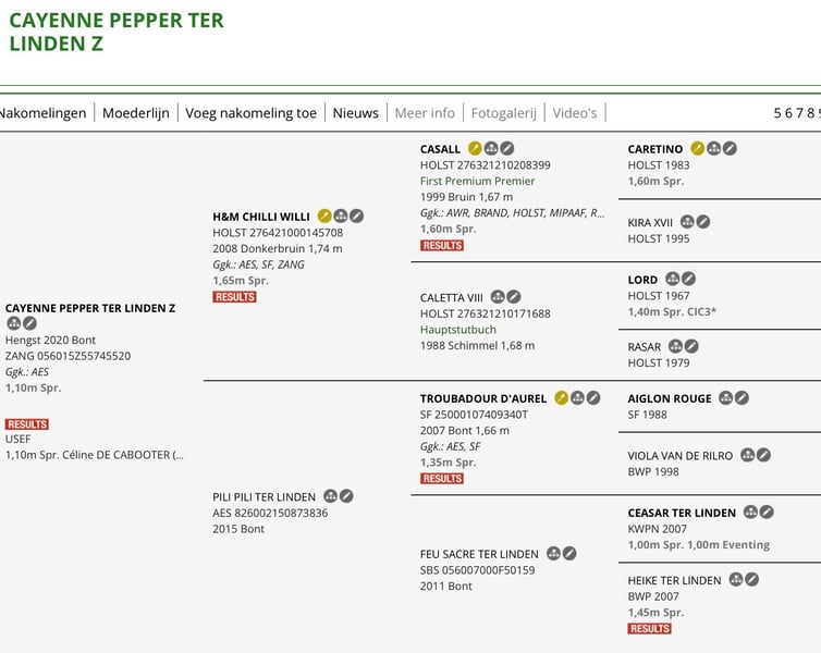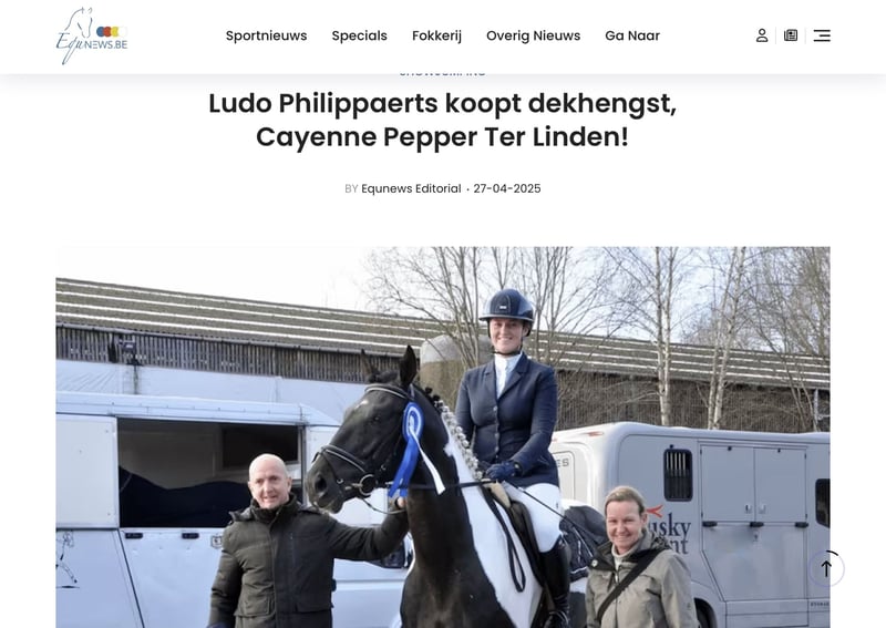 Chique merrie met super beweging veel bloed en topafstamming ( zie foto’s ) Ze is drachtig van de jonge exclusieve hengst Cayenne Pepper die in eigendom is van Ludo Philippaerts . Slechts enkele merries zijn er van gedekt . De familie Philippaerts stoomt deze hengst nu klaar om op het allerhoogste niveau te presteren en komt de eerste jaren niet meer ter dekking. Dus het veulen die zal geboren worden eind mei wordt natuurlijk een Exlcusive specialleke en een paardje voor de topsport en/of fokkerij . Just on Time is perfect gezond en heeft geen gebreken en is volledig in orde met alle vaccinaties en ontworming . Studbook BWP . Foto 1 is vandaag . Foto 2 is met haar veulen vorig jaar . Richtprijs 7500 0478/43.44.45 Chic mare with superb movement, great bloodlines, and top pedigree (see photos). She is in foal to the young, exclusive stallion Cayenne Pepper, owned by Ludo Philippaerts. Only a few mares have been covered by him. The Philippaerts family is now preparing this stallion to perform at the very highest level, and he will not be available for breeding for the first few years. Therefore, the foal to be born at the end of May will naturally be an Exclusive special and a horse for top-level sport and/or breeding. Just on Time is perfectly healthy, has no defects, and is fully up to date with all vaccinations and deworming. Studbook BWP. Photo 1 is today. Photo 2 is with her foal last year. 0478/43.44.45