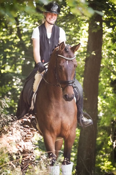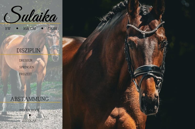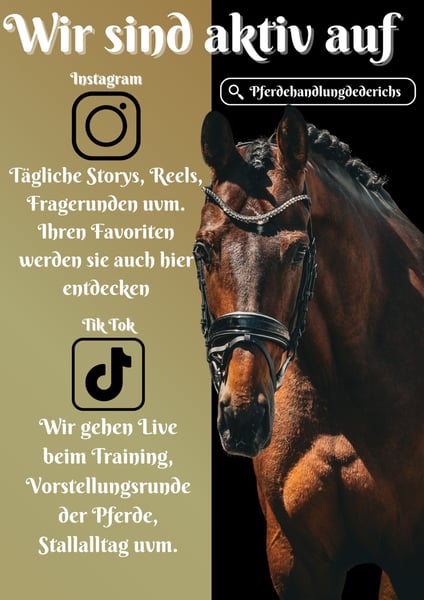 Sulaika ist eine 2018 geborene BWP Stute ca. 168 cm v. Indian Rock, Apache; Vivaldi x Escolar, World Cup *Sulaika* ist eine bildschöne und super coole Stute. Sie bringt 3 übermäßig gute GGA mit, ist dabei aber super zu sitzen und leicht in die Anlehnung zu reiten. Sie ist vom Gemüt ruhig und lässt sich eher anschieben, als das man halten muss. Sie eignet sich auch super für Jugendliche oder als Umsteigerpferd. Sie geht mehr als gerne ins Wasser und ist absolut toll im Gelände zu reiten. Sie ist unerschrocken und macht sehr viel Freude !!! SCHAUEN SIE SICH UNBEDINGT IHR VIDEO AN !!! Ein Pferd das in jedem Viereck glänzt und mit dem man ebenso die Seele im Gelände baumeln lassen kann. Im Umgang super unkompliziert und schmusig, genießt es umsorgt zu werden. Ein aktuelles Video finden Sie hier in der Anzeige oder unter folgendem Link: https://youtu.be/EMzG2C-nmbk Pferdehandlung Dederichs – Ihr Partner für den Pferdekauf Kontakt & Erreichbarkeit: Anfragen bitte ausschließlich telefonisch unter 0173/9792139 Montag – Freitag: 09:00 – 18:00 Uhr Samstag: 09:00 – 15:00 Uhr Sonntag: Ruhetag Folgen Sie uns auf Social Media! Erleben Sie unseren Alltag mit den Verkaufspferden auf Instagram, TikTok & Facebook unter Pferdehandlung Dederichs Rabatt: Bei sofortiger Mitnahme Ihres neuen Traumpferdes erhalten Sie zwischen 5 %– 10 % Rabatt Probereiten & Vorführen: • Probereiten: 30 € pro Pferd (max. 2 Reiter), Betrag wird beim Kauf angerechnet • Feiertage: Proberitt 50 € • Vorführung durch unsere Bereiter: 25 € pro Pferd (Vorreiten, Bodenarbeit etc.) Ankaufsuntersuchung & Transport: • Viele unserer Pferde besitzen bereits eine AKU • Sie können selbstverständlich Ihren eigenen Tierarzt mitbringen • Gerne organisieren wir eine Untersuchung • Wir unterstützen Sie auch gerne beim Transport ins neue Zuhause Weitere Verkaufspferde: In unserem Stall stehen weitere Verkaufspferde, die noch nicht online sind. Falls Ihr Traumpferd noch nicht dabei ist, zögern Sie nicht, uns zu kontaktieren. Wichtige Hinweise: • Stockmaß-Angaben sind geschätzt und nicht exakt nachgemessen • Alle Beschreibungen sind subjektive Einschätzungen des Verkäufers und keine zugesicherten Eigenschaften