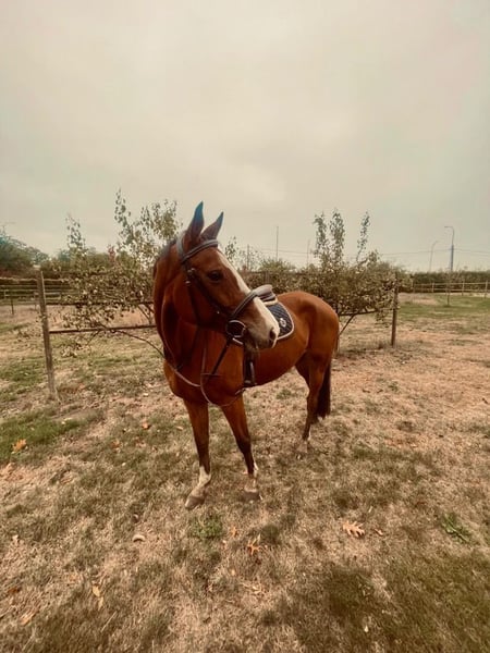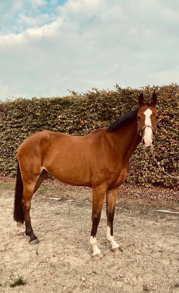 Rumba van de Goorbossen Rumba is a compact 8-year-old mare approximately 1.65 meters tall, with a strong sport pedigree. Her sire is the renowned Le Blue Diamond van 't Ruytershof, and her dam is Justine van de Goorbossen (by Casantos). This quality is clearly reflected in her appearance, movement, and posture under saddle. At the age of 4, Rumba was fully inspected and briefly backed. Due to lack of time, she was turned out to pasture again. She has been back in training for two months now and is progressing very well. She masters the basic gaits confidently and displays a lot of balance, suppleness, and willingness to work. She is very well-behaved and calm in handling, but under saddle, she can be sensitive. Therefore, she is not suitable for beginners but rather for an experienced rider with a calm and consistent approach. We are continuing her training, and she shows potential for sport. She is definitely a horse with whom you can grow together. The price depends on her current level of training. Rumba is good with the farrier and loads onto the trailer or van without any issues. For more information or videos, please feel free to send a private message.