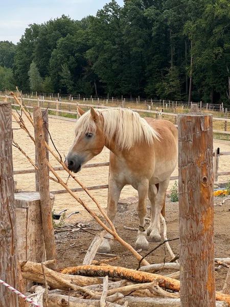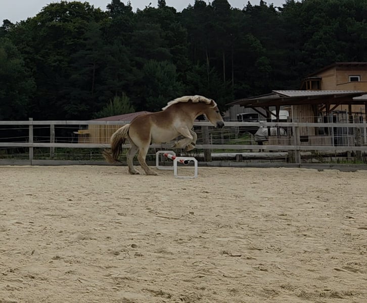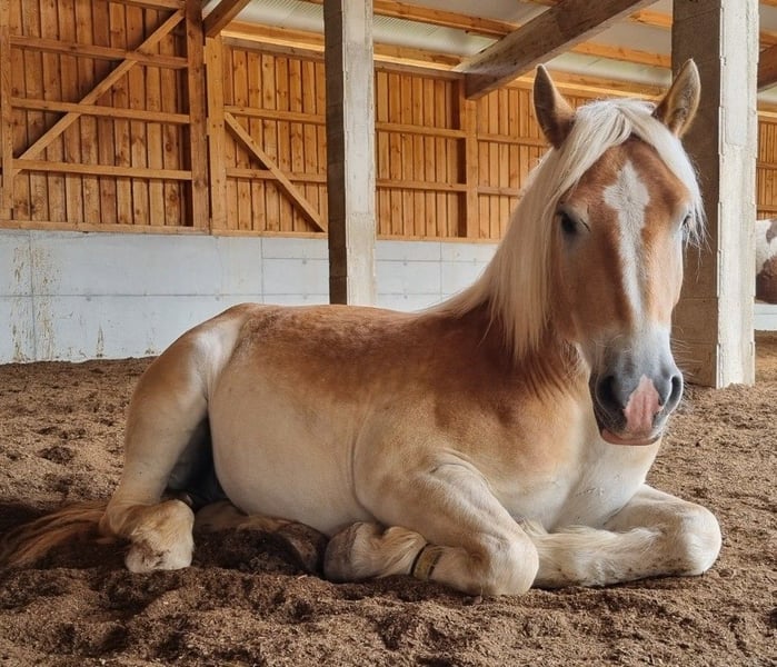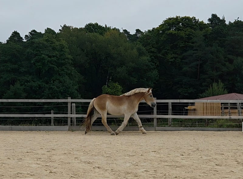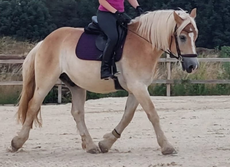 Beautiful 5-year-old draft gelding is looking for his special person. Obelix was born in 2020 and currently stands at 1.64 m (16.1 hh). Since spring 2024, he has been worked in a tensegrity style, making him well-prepared as a riding horse. In summer 2024, he was started under professional guidance. He is confidently ridden in all basic gaits in the arena and shows himself to be very rideable, strong in movement, and eager to perform. Thus, nothing stands in the way of a career as a "dressage draft horse." He also enjoys free jumping, so a few gymnastic jumps under saddle will surely not be a problem. He goes out alone and in groups without any issues and shows himself to be unflappable and well-behaved in the field. He is familiar with the Extreme Trail Park and willingly accepts the tasks presented to him. He is a very sensitive horse and responds delicately to the aids, which is why he is not suitable for beginners or anxious riders. This is the only reason he is for sale – he needs a person by his side who appreciates his sensitive and gentle nature, and unfortunately, we have not found the right connection. Obelix is healthy, barefoot, and well-behaved with the farrier. He loads calmly into the trailer and can be loaded alone. He lives in a mixed herd and ranks high but is not the herd leader, showing himself to be very socially compatible. A true heart horse with a lot of potential. His freshly fitted jumping saddle can be taken over. He will only be sold to the best hands and good care; here, quality comes before price!