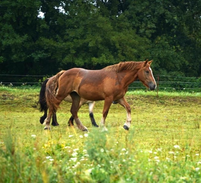 Svala ist eine fast 3-jährige Rheinisch-Deutsche Kaltblutstute (PSSM1 frei) und entstammt einer Antonio x Orloff Mutter. Der Vater ist Conrad v. Brück (bis M platziert). Diese schöne Jungstute in auffälliger Dunkelfuchsjacke mit großem Auge und sportlichem Körperbau ist dem Menschen sehr zugewandt, aufmerksam und verschmust. Svala wächst im altersgemischten Herdenverband auf und ist weder die ranghöchste noch rangniedrigste Stute. Sie besitzt volle Papiere, ist gechippt und wird regelmäßig entwurmt, geimpft sowie dem Schmied vorgestellt und kennt das Verladen mit Anhänger und LKW. Sie passt aufgrund ihrer Farbe leider nicht in unsere Gespanne und sucht ab demnächst ein neues Zuhause.
