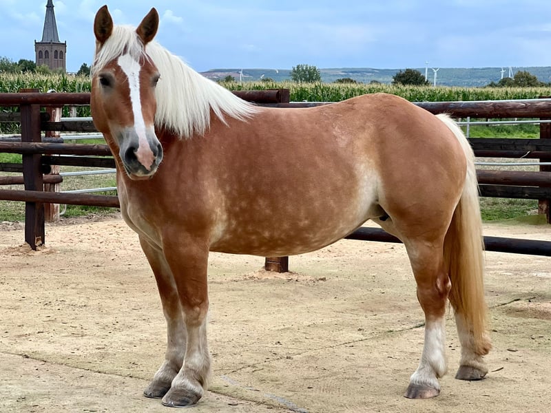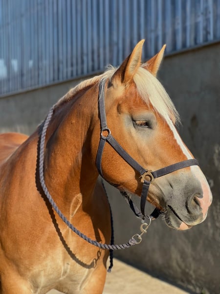 Aufgrund persönlicher Umstände suche ich schweren Herzens ein neues, liebevolles Zuhause für meine Rheinische Deutsche Kaltblutstute Heidi. Heidi wurde im Juni 2019 geboren und wird in diesem Sommer 7 Jahre alt. Sie misst knapp 1,60m. Sie läuft sowohl barhuf als auch beschlagen problemlos. Aktuell steht Heidi in einer Offenstallgruppe und ist E-Zaun-sicher. In der Herde zeigt sie sich eher rangniedrig und geht Konflikten lieber aus dem Weg. Heidi ist im Gelände angeritten und zeigt sich auch auf dem Reitplatz sehr motiviert und lernwillig. Zudem wurde sie bereits eingespannt und hat beispielsweise die Reithalle abgezogen. Auch dabei war sie stets arbeitsfreudig, zuverlässig und motiviert. Sie ist sehr händelbar, geländesicher und menschenbezogen. Aufgrund ihres ruhigen Wesens kann ich mir sehr gut vorstellen, dass sie ein verlässliches Kutschpferd wird. In den letzten Jahren war Heidi außerdem regelmäßig bei Kindergeburtstagen im Einsatz. Dabei zeigte sie sich immer tiefenentspannt, geduldig und genoss die Aufmerksamkeit der Kinder. Auch eine Tätigkeit als Therapiepferd könnte ich mir für sie sehr gut vorstellen. Heidi liegt mir sehr am Herzen. Daher wünsche ich mir für sie nicht nur ein neues Zuhause, in dem sie gut versorgt wird, sondern einen Platz, an dem sie geliebt und als Teil der Familie angesehen wird.