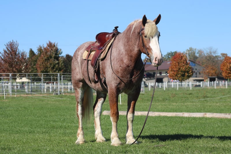 🎲𝓽𝓱𝓮 𝐑𝐈𝐃𝐄𝐑'𝐒 𝓒𝓱𝓸𝓲𝓬𝓮🎲 Happening now thru MONDAY | NOVEMBER 17th - Available EXCLUSIVELY on HorseBid's website! For more details and to register visit: www.Horsebid.com CONSIGNOR CONTACT: Hershberger's Farm 330-600-0197 LOCATION: Millersburg, Ohio BREED: Belgian X Quarter Horse REGISTERED: No REGISTERED NAME: Hershey's Chromer COLOR: Red Roan HEIGHT: 17 AGE: 4 GENDER: Gelding WOW WHAT A STAND OUT!!! Meet Hershey's Chromer!! He is a 4 year old draft cross gelding that is very pretty to look at. Chromer has been used for all types of jobs here on the farm. He has a very quiet temperament but is still very athaletic! He has been driven single a lot as well as double and has also been out in heavy traffic a lot and doesn't mind it at all. Chromer has been on countless trail rides and doesn't mind being ridden English or Western. He is totally beginner safe for anyone to ride or drive. Chromer picks up both leads and will easily step up and canter when he is asked to. He has a nice slow and smooth canter for a draft. Chromer was giving rides here on our farm this summer so he is used to getting lots of attention and he loves all of it!! He is very friendly with kids and also very gentle in the barn.. Chromer will walk up to you in the pasture. He stands nice for the farrier and loves getting a bath. Hershey's Chromer is very special and will always be the crowds favorite!!! If you would like to learn more about Hershey's Chromer call or text John @ 330-600-0197.