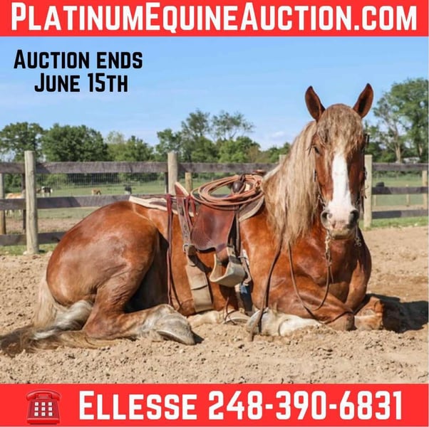 ONLINE AUCTION Place your bids at www.PlatinumEquineAuction.com Starting Bid $3500 Auction ends June 15th, 2025 Need a new saddle? Check out White Rock Saddles on our website or Facebook! Blackstone’s Kernel, or Kernel as we call him around the farm is the kind of horse that turns heads wherever he goes. This stunning boy is 6-years old, and stands 16.3hh! He is silver dapple in color with a flaxen mane and tail! He is a Belgian Gypsy Vanner cross gelding who is remarkable in every way. He has deep dapples when the sun shines on him and has a natural wavey mane and tail. Kernel is a powerhouse of strength, versatility, and athleticism. For a horse of his size, kernel moves with incredible grace and fluidity, making him not only a reliable mount but also an athlete in his own right. Whether you are riding Western, English, over fences or bareback, kernel delivers an exceptional experience, seamlessly transitioning between disciplines with ease. He knows all liberty work such as how to lay down, sit and even say yes and no. He is 100% a people loving horse who will greet you at the gate every day!! What truly makes Kernel stand out is his “been there, done that” attitude. He is the definition of a bombproof horse—absolutely safe in any environment. Kernel has been ridden on state roads, there’s not a truck too big to scare him! in the woods, open fields, and has even gone on a shopping trip to our local farm store! His beautiful chocolate color blonde mane and tail and flowing feathers capture everyone’s attention! One glance into his big brown eyes will steal your heart. Out on the trails, Kernels calm, and steady nature shines. Water crossings, tarps, bridges and other common obstacles do not phase him in the slightest. His even temperament makes him an ideal horse for beginners who need a forgiving partner, while his experience and smooth gaits make him just as enjoyable for advanced riders. Kernel is the rare horse that adapts to his rider’s needs, making him a perfect fit for anyone from novice to seasoned equestrians, from small kids to savvy teens and timid adults he will take care of you! And speaking of smoothness, Kernels three gaits are simply unbeatable. His walk, trot, and canter are incredibly fluid and comfortable, making him perfect for all-day rides without leaving you sore. Whether you are working in the arena or exploring the trails, kernels athleticism and stamina ensure he will keep going strong, mile after mile. In short, Kernel is the full package: strikingly beautiful, strong, athletic, and most importantly, safe. If you are looking for a versatile horse that excels in riding in a variety of disciplines from English to western, jumping cross country in the arena or even in harness he’s done it! Kernel is the perfect partner. He is ready to take on anything, whether you are a beginner looking for safety or an experienced rider seeking a smooth, dependable horse for long adventures. Kernel lives in Howell, MI 48855. Please call or text Ellesse Schwartz at 248-390-6831 for more information. ONLINE AUCTION Place your bids at www.PlatinumEquineAuction.com Starting Bid $3500 Auction ends June 15th, 2025 Need a new saddle? Check out White Rock Saddles on our website or Facebook!