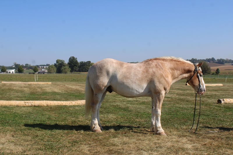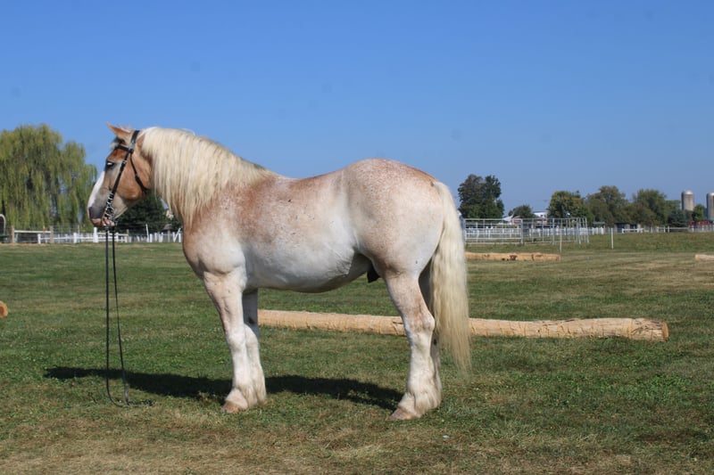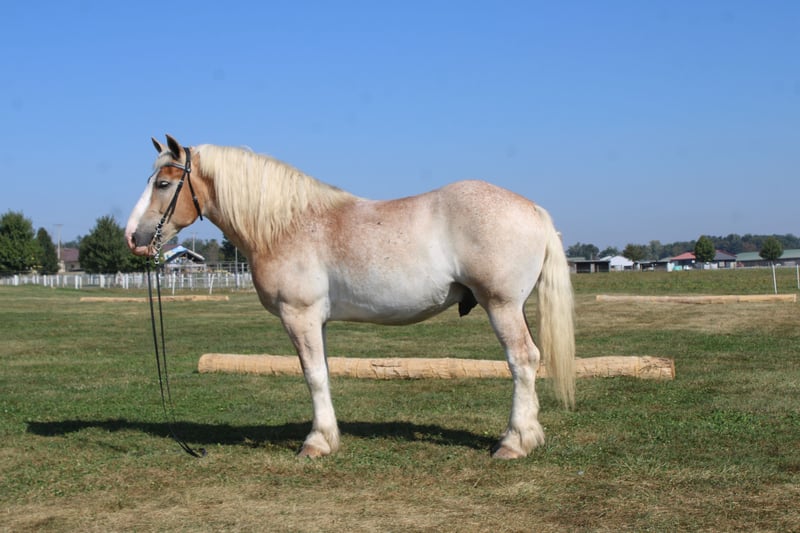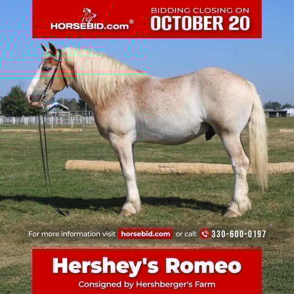 ♦️ 𝐭𝐡𝐞 𝐀𝐌𝐄𝐑𝐈𝐂𝐀𝐍 𝓕𝓪𝓵𝓵 𝓒𝓵𝓪𝓼𝓼𝓲𝓬 ♦️ Happening now thru MONDAY | OCTOBER 20th - Available EXCLUSIVELY on HorseBid's website! For more details and to register visit: www.Horsebid.com CONSIGNOR CONTACT: Hershberger's Farm 330-600-0197 LOCATION: Millersburg, OH BREED: Belgian X Quarter Horse REGISTERED: No COLOR: Strawberry Roan HEIGHT: 16.1 AGE: 7 GENDER: Gelding Hershey's Romeo is A 7 year old strawberry roan Belgian X Quarter Horse. KIDSAFE, RIDES, DRIVES, TRAFFIC SAFE, STANDS TO MOUNT, GETS ALONG WITH OTHER HORSES!!!! HERSHEY'S ROMEO CHECKS ALL THE BOXES!!!! R0me0 stands A perfect 16.1 HH. The right size, color, and conformation that makes him really special!! He is very well trained to ride and drive. He has been driven in a team as well as single. Romeo does great on trails as he is very sure footed for stepping over logs and going a rugged trail. When trail riding Romeo also loves going through a stream or wade in a river or pond and play in the water. Romeo also does great at picking his feet up when cleaning them out and for the farrier. Romeo as been used here a lot for carriage rides and giving kids rides in our Merry-Go-Round. Whether it is driving him out on the busy state road or going for a leisure ride through the trails he is always very brave and will go wherever you point him. Here is a very sweet minded horse that has that beautiful roan color that will stand out wherever you go!!!! HERE HE IS HERSHEY'S ROMEO THAT NICE HANDY SIZE... FOR MORE INFO CONTACT JOHN @ 330 600 0197.