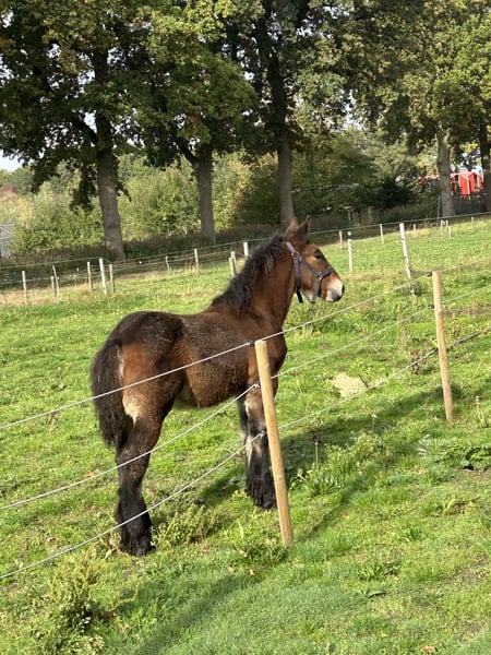 Te koop Prachtig bruin trekpaard hengstveulen. Geboren in 2025, reserve kampioen op de veulenkeuring kvth. Braaf karakter.