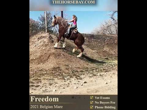 Freedom is a 5-year-old, 18.2-hand Belgian mare with an absolute heart of gold. She truly is what dreams are made of—from her incredible disposition and sweet, kind personality to her willing attitude and striking looks. This mare turns heads everywhere she goes and has the temperament to match her beauty. Freedom has been exposed to all aspects of trail life, from mountain rides to town riding. She confidently rides alongside bikes, strollers, runners, and heavy traffic. She has passed semis without flinching, crossed bridges, gone under tunnels, and walked straight through rivers like it’s nothing. She’s steady, reliable, and takes everything in stride. Not only is Freedom a trail pro, but she also has a solid foundation in the arena. She has a smooth, comfortable walk, jog, and lope, and works beautifully off your voice. She stops off your seat and voice cues and is incredibly thoughtful—she’s even learned to stop and wait if you lose your balance, giving you time to regain your seat. Freedom is well-mannered and easy to handle. She lowers her head willingly for the halter and bridle and will side-pass to the mounting block, standing patiently while you get on. She goes barefoot with strong, solid feet and handles farrier work like a pro, even without stocks. She picks up her feet easily and stands quietly. On the ground, Freedom is just as special. She stands to be brushed and loved on, ties quietly for as long as needed, and genuinely enjoys attention. She has also been exposed to flags, tarps, and the beginning stages of collection work. She rides both English and Western and looks beautiful doing either.