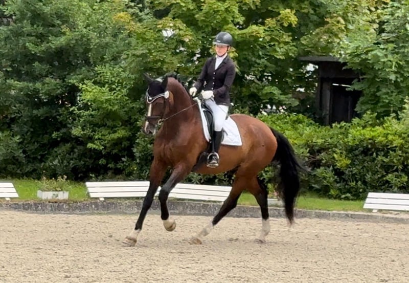I am looking for a new home for my Italian gelding. He was born in 2008, stands 180 cm tall, and is a very friendly and reliable partner. Due to personal reasons, I no longer have the time to give him the attention he deserves. Therefore, I am seeking a new owner for Chianti, where he can stay forever. He is trained up to L-level dressage and jumping, with competition placements. He has also gained experience in eventing and is dependable and fearless in the cross-country phase. He approaches groundwork and pole work with great enthusiasm. Chianti is easy-going and open-minded when interacting with other horses. He is always looking for a playmate, so I would prefer herd life for him. He is familiar with both pasture turnout and stable living. I purchased him at age 10 with mild shivering and a hypoplastic soft palate. Both issues have been veterinary-checked and he has been successfully competing since then. With plenty of movement opportunities and a large box stall, the shivering is now hardly noticeable. This summer, Chianti sustained an injury to his right front suspensory ligament. The injury has healed well, and he is back in training.
