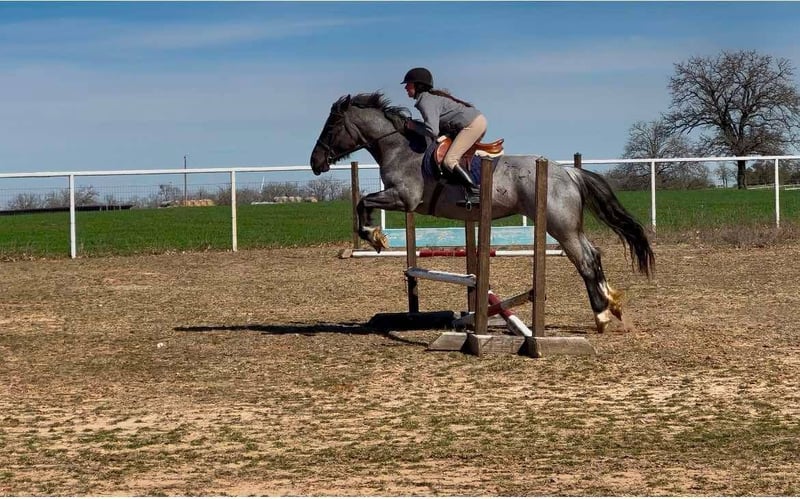 ONLINE AUCTION Place your bids at www.PlatinumEquineAuction.com Starting Bid $3500 Auction ends May 18th, 2025 Need a new saddle? Check out White Rock Saddles on our website or Facebook! Are you ready to add a touch of class to your barn? Look no further than our stunning blue roan mare, Alexander’s Pistol Annie, affectionately known as Blue Bell around the barn. This 2020 model is not just any horse; she’s a one-of-a-kind beauty registered with the American Shire Horse Association Sport Horse Registry. Standing 15.3 hds tall and as stout as one comes. Blue Bell is the whole package! With all the right buttons to make her a versatile partner, she’s ready for you to mold her into your dream horse. She’s been started over jumps and shows incredible promise as a hunter-jumper or a 3-day eventer. And let’s not forget her dressage potential—her floaty trot and canter are sure to turn heads in the arena! This mare is athletic, eager to learn, and always willing to please. Blue Bell glides through a walk, trot, and lope with beautiful, smooth transitions. She’s soft in the mouth, breaks at the poll, and has a big, impressive sliding stop that will leave you in awe. Blue Bell isn’t just a pretty face—she’s also a seasoned traveler! She’s been hauled to barrel races and ropings, proving to be completely unbothered by the hustle and bustle. Whether it’s a fun ride down the trails or a trip to the historic Fort Worth Stockyards, with horse-drawn carriages, loud music, and heavy traffic, she remains calm and collected, always stealing the show with her stunning looks. Her trail riding skills are top-notch; she confidently crosses logs, bridges, and water, tackling any terrain with ease. Blue Bell has even ventured into the mountains and rocky paths, proving her versatility. Plus, she has a natural knack for ranch work, showing off her impressive cow sense as she learns to pen rope and heel the donkey. Gentle and sweet, Blue Bell is a dream to handle—whether in the stall or out in the pasture. She’s easy to catch, stands patiently for the farrier and vet, and is a breeze to bathe. Loading and unloading from the trailer is a non-issue. Don’t miss out on the opportunity to own this extraordinary blue roan mare that will make all your friends and neighbors jealous. Blue Bell is ready for her next adventure with someone who appreciates her unique charm and versatility. Come see her in person! Or if you aren’t able to make it schedule a FaceTime showing with us. If you need help with transport don’t hesitate to ask we have a list of reputable haulers that can get her safely to your doorstep WORLD WIDE including, Alaska , Mexico, Hawaii and Canada. Contact M $ Performance Horses Michelle 661-817-9120 with any questions or to make a Buy It Now Offer. Located in Stephenville, TX. ONLINE AUCTION Place your bids at www.PlatinumEquineAuction.com Starting Bid $3500 Auction ends May 18th, 2025 Need a new saddle? Check out White Rock Saddles on our website or Facebook!
