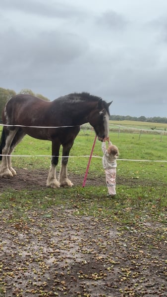 Unfortunately, I have to part with my Shire mare "Wolke" with a heavy heart, as I can no longer do her justice due to personal and family circumstances. "Wolke" impresses primarily with her consistently loving and honest nature. I purchased her directly from a breeder in the Netherlands when she was 3 years old. She was gently backed at age 6 and is open to all kinds of fun, always remaining calm and unshaken. We spent a lot of time in nature, during which she shows herself to be fearless and confident. She is a very curious and eager-to-learn mare. I am looking for a person or family who enjoys and is willing to continue her training and development, as unfortunately, this has been too limited so far. In the arena, she is easy to ride in walk and trot; she has only been in canter in the field so far. Wolke has no bad habits; if something seems new or strange to her, she simply stands quietly to observe the situation calmly. Wolke is familiar with dogs, cats, and children, and remains relaxed and friendly in these environments. She has some metabolic issues that manifest seasonally with mild signs of summer eczema or skin problems. With proper feeding, management, and care, these issues can be well controlled. She stays in her box at night and is turned out on pasture during the day. She is barefoot and loads easily alone. Due to lack of time and personal circumstances, Wolke has not been ridden in the past year, so any trial riding would need to be very limited, as she needs to rebuild her musculature. I wish for her a new, loving home where she can receive the time and attention she deserves! I can also very well imagine her as a broodmare or therapy horse. She has full papers from the Shire Horse Society in England. An absolute heart horse who would go through thick and thin with her human! This is not a distressed sale, so place takes precedence over price!