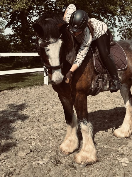 Helaas moet ik mijn Shire Horse merrie "Wolke" met pijn in het hart aan een nieuwe eigenaar geven, omdat ik haar door persoonlijke en familiale omstandigheden niet meer de tijd en aandacht kan geven die ze verdient. "Wolke" valt vooral op door haar altijd liefdevolle en eerlijke karakter. Ik heb haar op driejarige leeftijd direct van een fokker uit Nederland gekocht. Op zesjarige leeftijd is ze voorzichtig aangezet tot rijden, en ze is voor ieder plezier te gebruiken, zonder ooit uit haar rust te raken. We zijn veel in de natuur geweest, waar ze zich onbevreesd en zelfverzekerd toont. Ze is een zeer nieuwsgierige en leergierige merrie. Ik hoop op een persoon of gezin dat plezier en vreugde haalt uit het verder opleiden en stimuleren van haar, want dat is helaas te kort gekomen. Op de longeerbaan kan ze probleemloos in stap en draf worden gereden; galopperen doet ze tot nu toe alleen in het terrein. Wolke vertoont geen ongewenst gedrag; als haar iets nieuw of vreemd lijkt, blijft ze rustig staan om de situatie in alle rust te bekijken. Wolke is bekend met honden, katten en kinderen en toont zich hier ook kalm en zeer vriendelijk. Helaas heeft Wolke problemen met haar stofwisseling, die seizoensgebonden soms lichte zomereczeem- of huidproblemen kunnen veroorzaken. Met het juiste voeder- en huisvestings- en verzorgingsmanagement is dit echter goed onder controle te houden. Ze staat 's nachts in haar box en gaat overdag op de wei. Ze loopt zonder hoefbeslag en laat zich probleemloos alleen laden. Wolke is het afgelopen jaar niet bereden vanwege gebrek aan tijd en persoonlijke omstandigheden, daarom zou een proefrit beperkt moeten blijven, omdat ze eerst haar spieren weer moet opbouwen. Ik hoop dat ze een liefdevol nieuw thuis vindt waar ze de tijd en aandacht krijgt die ze verdient! Ik kan me haar ook goed voorstellen als fokmerrie of therapiehond. Ze beschikt over volledige papieren van de Shire Horse Society uit Engeland. Een echt hartendier dat met haar eigenaar door dik en dun zou gaan! Dit is geen dringend verkoop, daarom gaat de prijs onder de plek.