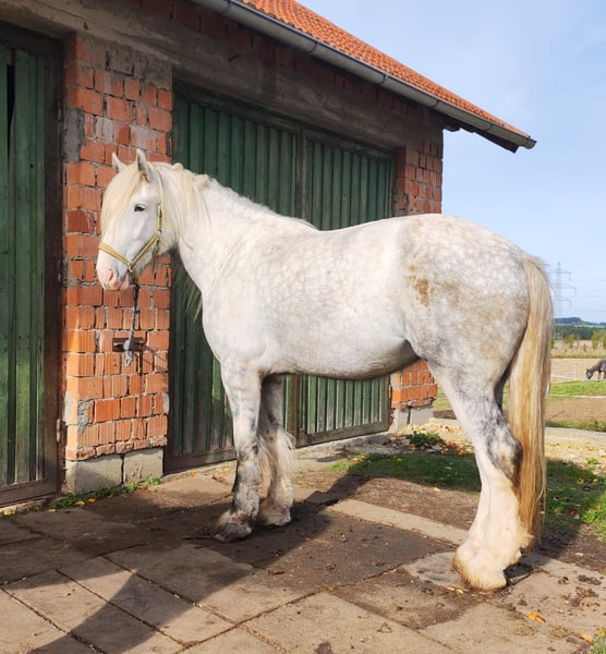 ✨ Wunderschöne Shire Horse Stute – ideal für die Freizeit ✨ Zum Verkauf steht eine beeindruckende Shire Horse Stute, geboren im Jahr 2021. Diese elegante Schimmelstute beeindruckt mit ihrem imposanten Stockmaß von 1,82 m und ihrer majestätischen Erscheinung. Sie ist freundlich, menschenbezogen und ausgeglichen – ein echtes Herzenspferd für alle, die ein sanftes und zuverlässiges Shire Horse für Freizeit und gemeinsame Zeit suchen. Ob Spaziergänge, Bodenarbeit oder gemütliche Ausritte: Diese Stute ist eine treue Begleiterin, die mit ihrer Ruhe, Gelassenheit und ihrem Charme begeistert. Sie ist gesund, regelmäßig geimpft und bestens gepflegt. Im täglichen Umgang zeigt sie sich brav, verschmust und sehr lernwillig. Tierarzt, Hufschmied und Hängerfahren kennt sie bereits und meistert diese Situationen mit Geduld und Vertrauen. Aufgrund eines kleinen Handicaps, das sie im Alltag nicht beeinträchtigt, wird sie deutlich unter Wert abgegeben – statt 9.500 € nun 4.500 €. Wir wünschen uns für sie ein liebevolles Zuhause bei Menschen, die Verständnis, Geduld und Freude am Umgang mit einem besonderen Pferd haben. Diese außergewöhnliche Stute ist perfekt für Pferdemenschen, die nicht nur ein Reitpferd, sondern eine treue Partnerin fürs Herz suchen – ein Pferd, das mit Ausstrahlung, Charakter und Sanftmut begeistert.