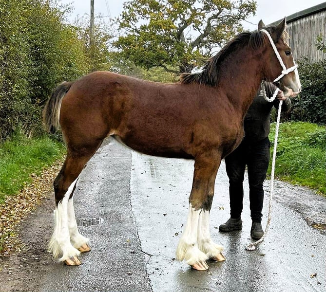 This well bred young Shire filly is very good show quality and has a very nice temperament. Perfectly marked she will make a high quality big mare. For more about her please email sheila@shiresandclydesdales.co m UK and WORLDWIDE Seriously interested prospective new owners are welcome to see our horse here in Shropshire UK .