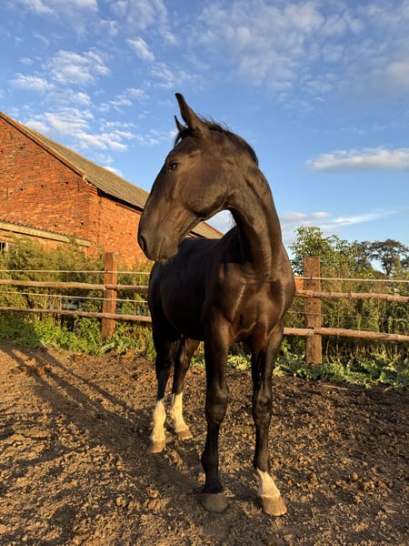 Silesian stallion, one and a half years old. Very friendly and curious. Always approaches people in the paddock. Daily turnout. Beautiful coat color - 3 socks and a star on the forehead. Unique sheep nose. Regularly trimmed. Current height: 155 cm. Will be a tall horse. I will send videos via SMS/WhatsApp. Father is in the second to last photo and mother is in the last one. Father's height is 165 cm. Mother is 168 cm.