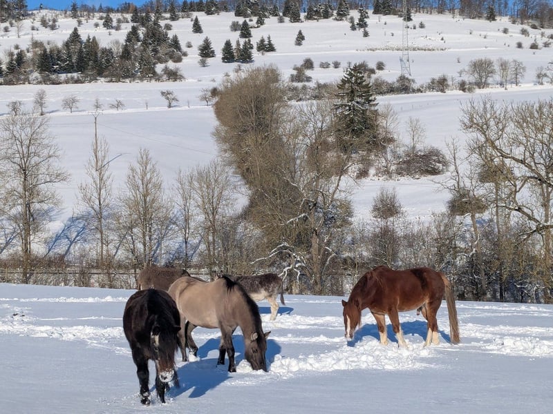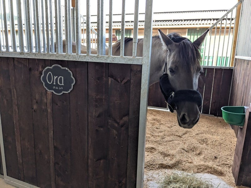 Taille au garrot 130 cm / Âge 8 ans / avec passeport équin. Notre jument Tarpan, Ora, est un poney de confiance absolue. Elle est sûre en extérieur dans toutes les situations, seule ou en groupe. Elle est fine et peut être montée sans problème par des débutants, et elle saute également bas pour les cavaliers légers. Elle a déjà été présentée en concours et y reste absolument détendue. Elle aime monter dans le van et y monte toute seule. Ora vit avec nous dans un troupeau mixte. Elle est pieds nus. Elle n'a jamais été malade durant toutes ces années. Actuellement, elle est en parfaite santé et sans eczéma. Elle connaît le pâturage toute l'année et n'a pas de fourbure. En raison de la réduction de notre effectif et du passage à un cheval de sport plus grand, nous la proposons à l'adoption. Merci de ne faire des demandes que pour un poids de cavalier maximum de 60 kg en raison de sa taille (130 cm) ! C'est un super poney avec lequel on peut tout faire : balades, randonnées, concours, elle fait tout. Pour un intérêt sérieux, merci de préférer un appel au 0172 5825627 (pas d'inquiétude, cela ne dérange pas). Un bon placement avant le prix. Ce n'est pas une vente urgente.