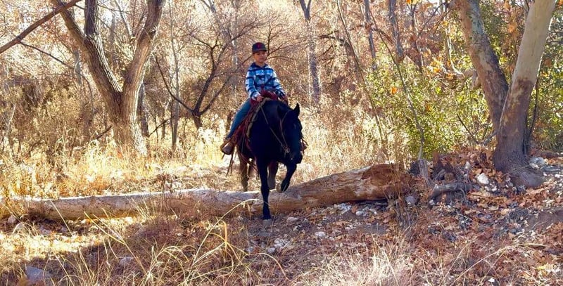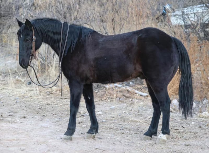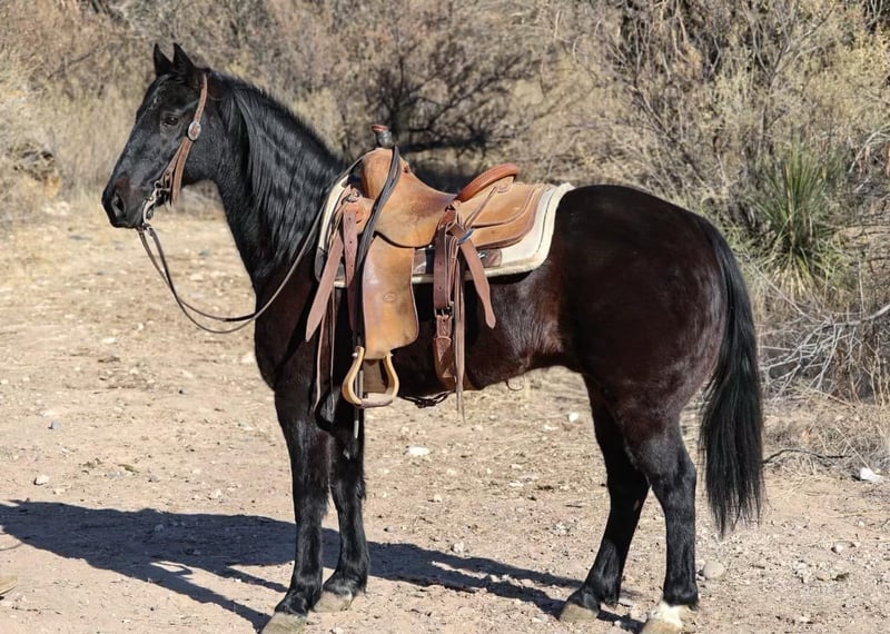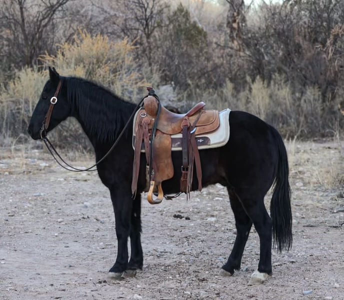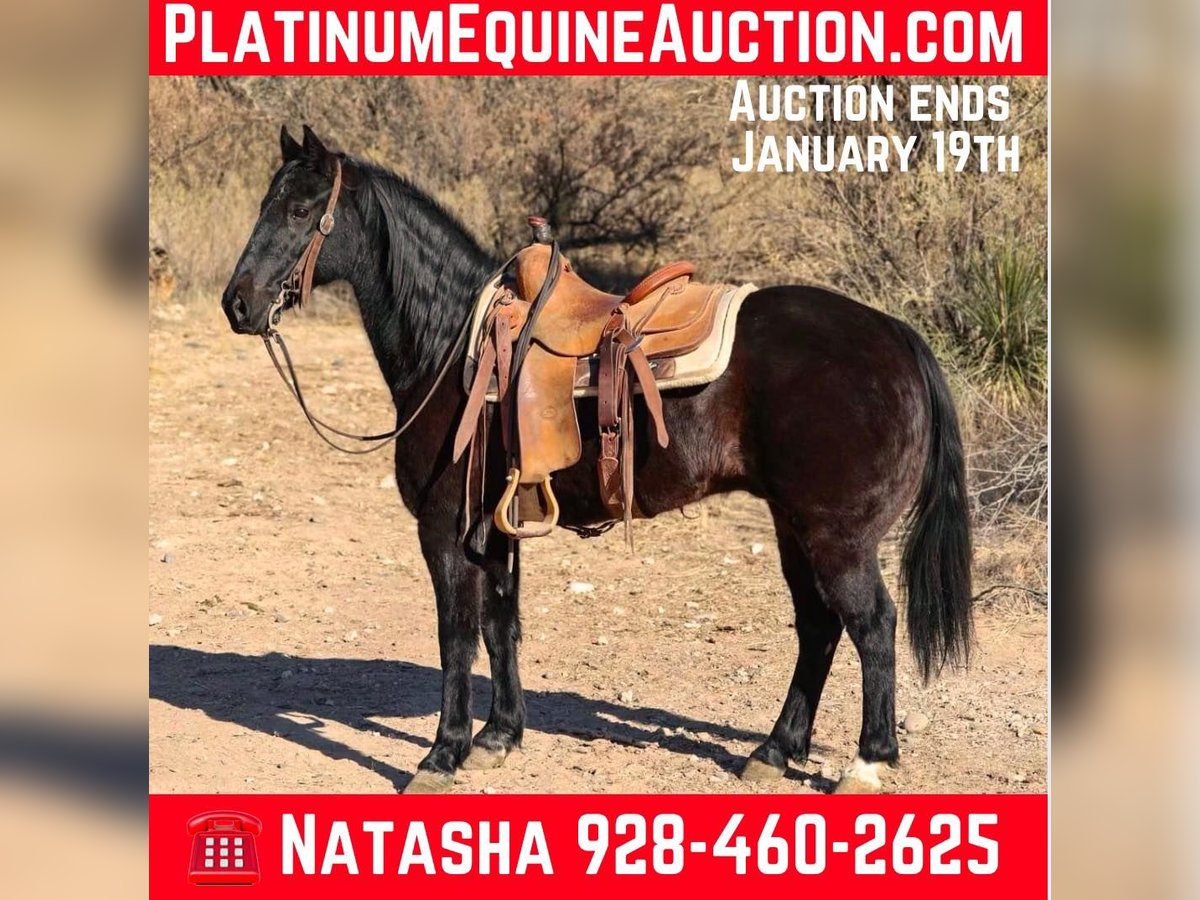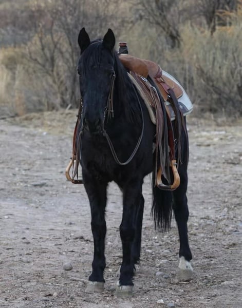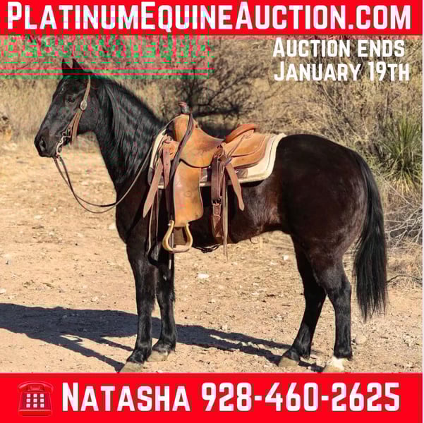 ONLINE AUCTION Place your bids at www.PlatinumEquineAuction.com Starting Bid $3500 Auction ends January 19th, 2025 Need a new saddle? Check out White Rock Saddles on our website or Facebook! Bandit is a 12 year old grade Missouri Foxtrotter gelding standing 14hh. This jet black, stunning gelding is absolutely safe for every level rider of any age and will cover some country! Bandit will set a smooth quick gait to get you where you need to go, or stroll on through town with ease! Not only is this gorgeous gelding an absolute blast to ride through town, he will go absolutely any direction you point him outside. Cruise on through rough rocky terrain, up and down steep mountainous country, venture through the thick brush, cross flowing rivers, or just mosey on down the trail. You name it and Bandit will take you through it without batting an eye. We’ve had kiddos and riders of all levels ride Bandit and he has taken great care of all of them. Bandit is absolutely safe and gentle for anyone and does move with a sense of purpose. Bandit is not only an absolute blast to ride, but he’s also an absolute gentlemen! Bandit is good to groom, saddle, bridle, bathe, and shoe! Transport can easily be arranged anywhere in the US!!! Located in Camp Verde, AZ. Contact D/C Equine Services Natasha 928-460-2625 or Dallas 804-822-2233. ONLINE AUCTION Place your bids at www.PlatinumEquineAuction.com Starting Bid $3500 Auction ends January 19th, 2025 Need a new saddle? Check out White Rock Saddles on our website or Facebook!