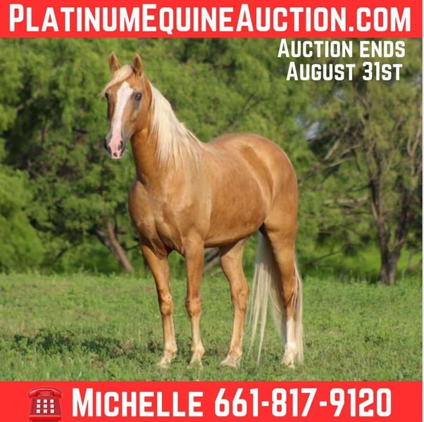 ONLINE AUCTION Place your bids at www.PlatinumEquineAuction.com Starting Bid $3500 Auction ends August 31st, 2025 Need a new saddle? Check out White Rock Saddles on our website or Facebook If you’ve been searching for that once-in-a-lifetime horse with the looks, experience, and ride to match — meet Barney. This handsome 15-year-old and standing 15hds Tennessee Walking Horse gelding is a golden palomino dream, with a long, luxurious mane and tail that flow like silk in the wind. His presence is undeniable, his gait is unforgettable, and his heart is as golden as his coat. Smooth, Stylish, and Surefooted… Barney is a trail rider’s deluxe with an ultra-smooth, natural 4-beat gait that will have you floating down the trail. Say goodbye to back pain — this guy glides effortlessly, making long days in the saddle feel like a relaxing ride through the clouds. Don’t Let the Age Fool You… At 15, Barney is in the prime of his life. He’s got a strong motor, plenty of go, and the stamina to take you wherever you want to ride. He’s the perfect mix of seasoned and spirited — responsive, willing, and full of life, with many years of riding adventures still ahead of him. Trail-Tested & Street-Savvy… Barney has seen it all — from crossing creeks and climbing hills to confidently walking down busy streets. He’s traffic safe, water crossing approved, and loves getting out and about. He even made a star appearance at the legendary Fort Worth Stockyards, where he stole the show and turned every head on the street. He knows how to handle a crowd, and he does it with style. Your Ultimate Trail Partner… Whether you’re looking for a flashy addition to your string, a comfortable gaited ride for long trails, or a steady companion for local events and town rides — Barney checks every box. He’s experienced, eye-catching, and fun to ride. Barney is more than a horse — he’s an experience. With his golden good looks, buttery-smooth gait, and fearless trail presence, this guy is ready to take you on your next unforgettable ride. We are open to anyone interested in him to schedule a time to come see him or if you can’t make it schedule a FaceTime showing to see him. If you need help with transport don’t hesitate to ask we have a list of reputable haulers that can get him safely to your doorstep WORLD WIDE including, Alaska , Mexico, Hawaii, Canada and anywhere in between from Stephenville, TX. If you have any questions contact Michelle with M$ Performance Horses 661-817-9120 ONLINE AUCTION Place your bids at www.PlatinumEquineAuction.com Starting Bid $3500 Auction ends August 31st, 2025 Need a new saddle? Check out White Rock Saddles on our website or Facebook