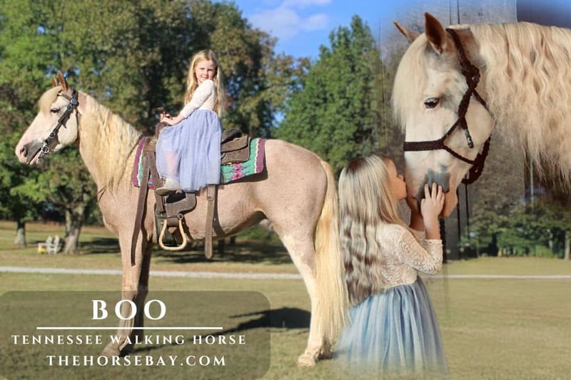 Boo is a 5-year-old Tennessee Walking Horse. He is a gorgeous red roan sabino color and stands 15 hands tall. Although some days he doesn’t know he’s a horse. He has a personality like a human, and often, I believe he thinks he is one of us. Boo is so gentle and loving. My 6-year-old daughter and he have become best friends, as she climbs the fence or his stall to love on him daily. He enjoys all the attention! For his history, he belonged to an 81-year-old gentleman who raised, trained, and rode him himself. Due to medical conditions, the man is no longer able to ride and wants to find Boo a new permanent home. This amazing horse is the perfect trail horse. As you watch the videos, he crosses anything, walks alongside quarter horses/my daughter’s pony, and will ride front, middle, or back of the group or out alone. We’ve taken Boo on numerous camping trips this year, as well as showing him at our local county fairs. There’s not much this horse hasn’t been exposed to and handled like a professional. Boo is good for the farrier, stands for a mounting block, and loves to be brushed on and spoiled. He’s an easy keeper at the barn; he stays in or outside as he pleases and has no issues with other horses. Boo is definitely a special horse. Not only is he easy on the eyes, but he also has the personality and gentle demeanor that make it easy for anyone to get along with him and enjoy riding him. For any additional information, feel free to call me.