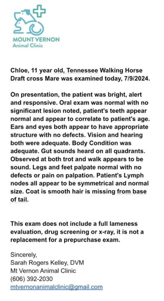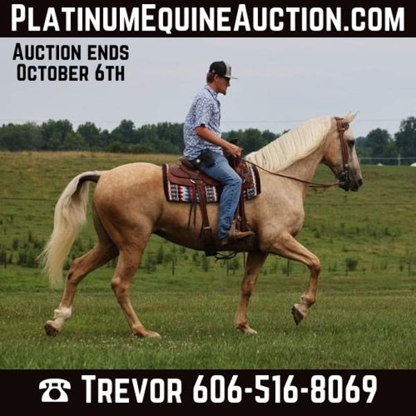ONLINE AUCTION Place your bids at www.PlatinumEquineAuction.com Starting Bid $3500 Auction ends October 6th, 2024 Need a new saddle? Check out White Rock Saddles on our website or Facebook! Different is good and Chloe is as different as they come! Chloe stands around 16.1hh, is very stout built and she is 11 years old. Chloe is a Missouri Foxtrotter Draftcross mare. She has the mind and build of the draft with with gait and movement of the foxtrotter… what a perfect combo!!! Chloe Throughout Big South Fork in TN and she knows all about those rough rocky trails and knows how to handle herself. She will go up or down even the steepest slopes, across deep creeks, over downed trees, and over all types of rough terrain while still being sure footed. She has been rode in traffic, and is very traffic safe around cars, semi, log, and dump trucks. If you need a smooth ride that won’t hurt your back??? Then look no further! Not only does she have the looks, she also has all the right moves! Chloe has that true foxtrotter gait that is comfortable for hours in the saddle on your back and your bottom will thank you! Chloe is the ultimate trail horse, saddle bags, highline ties, of course she hauls and loads easily. She does great out in the pasture with our mixed herd. She has a great attitude about whatever she is asked to do. Feel free to call Trevor Patrick 606-516-8069 with any questions. Located in Parkers Lake, KY. ONLINE AUCTION Place your bids at www.PlatinumEquineAuction.com Starting Bid $3500 Auction ends October 6th, 2024 Need a new saddle? Check out White Rock Saddles on our website or Facebook!