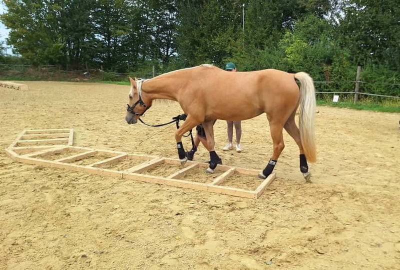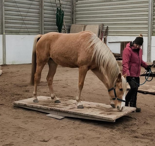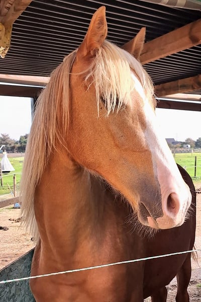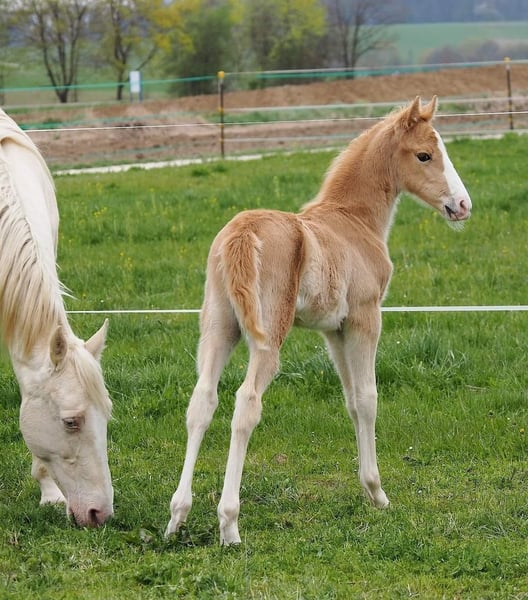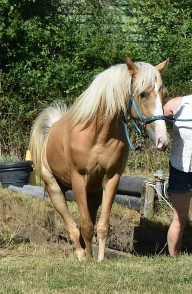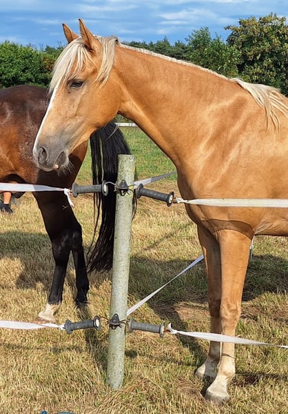 Royal Touch Of Gold aka „April“, ist eine 4-jährige, wunderschöne Palomino Stute. Ihr Pedigree spricht für sich. Ihr Vater ist Double Springs Label, der von Royal Label (Multi World Grand Champion) abstammt. Sie ist derzeit ca. 154cm und noch im Wachstum und besticht durch ein solides Fundament! Im Freilauf zeigt April einen schönen Flat Walk mit einem überzeugenden Overstride, sowie Running Walk. Sie hat dabei das typische Kopfnicken eines Tennessee Walking Horse. Ihre Lieblingsgangart ist ein wunderschöner Schaukelstuhl-Galopp. Diesen Canter beherrscht sie in allen Varianten. Von sehr langsam bis höheres Tempo. Für Gangpferdefreunde, die offen für alle Rassen sind und auf eine solide Gangveranlagung schauen, werden mit ihr ebenfalls ihr Glück finden. Je nach Vorlieben, kann die Veranlagung (auch Tölt) gefördert und ausgebildet werden. Ein Rohdiamant. Z.Bsp. kann ich sie mir sehr gut als viergängig (mit Tölt) gerittenes Pferd in Prüfungen vorstellen, wie z.B. in der Mehrgang-, Viergangprüfung, Pleasure, Gaited Working Equitation, Trail… und durch ihre selbstbewusste und unerschrockene Art, natürlich auch als Luxus Freizeit- und Geländepferd. Ihre Welt durfte sie als Handpferd kennenlernen (s. Videos). Um in den Wald zu kommen, ist es für uns normal die Pferde zu verladen und zu fahren. Auch das lernte April früh und selbstverständlich kennen. Durch Spaziergänge durch den Ort ist ihr der Straßenverkehr bekannt, wie auch andere Umweltreize, die damit einhergehen (Schulbus, Radfahrer, Baustellen, Trecker, Unterführungen usw..). Auch Spaziergänge ohne pferdische Begleitung macht sie gut. An Auswärts-Veranstaltungen hat April bereits teilgenommen, wie zB. Outdoor-Trail und Indoor-Trail, sowie an einigen Bodenarbeitskursen. Anhänger fahren und in einer fremden Umgebung auszusteigen, in einem fremden Paddock zu verweilen, macht sie gut. Fremden Pferden und neuen Dingen ist sie aufgeschlossen. Sie ist selbstbewusst und nervenstark. Ein feinfühliges Pferd, das auf kleinste Signale reagiert und einem Jungpferde erfahrenen Menschen viel Freude bereitet. Sie kennt Sattel und Trense und läuft erste Strecken mit Reitergewicht. All das macht sie gut mit (bei weiterer Ausbildung steigt der Preis). Sie ist lieb beim Impfen und beim Schmied, lässt sich gern im Sommer waschen und abspritzen... Sie lebt in einer gemischten Herde, worin sie sich in der mittleren Rangfolge befindet. Sie ist geimpft und wurde regelmäßig entwurmt. Zu ihr gehören TWHBEA Papiere, sowie einen Equidenpass. Wegen ihrer guten Abstammung und ihrer wunderschönen Farbe (sie besitzt mindestens ein Cremegen), ist sie auch für die Zucht interessant. Wir wünschen uns erfahrene Pferdemenschen, die Freude daran haben, ein junges Gangpferd weiter auszubilden.