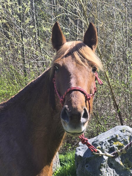 Meet Daisy - a striking 15.3 H Tennessee Walker mare. She boasts a beautiful, refined head, strong conformation, and excellent bone and feet. Daisy stands 15.3 H and shines with a beautiful chestnut color and flaxen mane and tail – her unique coloring and flashy movement never go unnoticed. Daisy is sound, healthy, and exceptionally well cared for. She is up-to-date on all vet care, including vaccinations, dental floating, deworming, and farrier work. She stands well for the farrier and is easy to handle on the ground. Under saddle, Daisy has a smooth 4-beat gait with a 12” overreach and a strong, forward walk. She has had 10 months of professional training and 2 years of diverse trail experience across the mountain trails of Washington state. She is very sure-footed, loves to move out, and excels with riders who understand gaited horses.This lady is as gentle as they come. She would be great for starting 4-H or show with minimal effort. She’s never been in foal but shows great promise as she has cared for other foals on the property. Kid and beginner friendly.