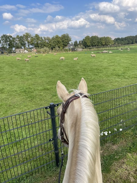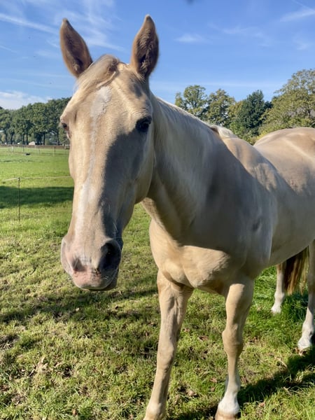 Opzoek naar een nieuw thuis voor deze prachtige en lieve merrie, Goldy. Ze is een echte eye-catcher met haar prachtige Gold Champagne kleur en heeft daar bij ook nog eens een hart van goud! Ze is veel buitengereden door haar vorige en huidige eigenaresses in grote en kleine groepen en daar geniet ze ook het meeste van, alleen naar buiten vind ze nog wat spannend maar met een ruiter die haar hierin kan begeleiden zal dit ook steeds beter worden. Ze staat nu bij mij (BlueGrass Walkers) in training om haar gangwerk (walk en galop) verder te ontwikkelen en ze pakt dit erg goed op. Het is een slimme dame dus je moet wel consequent zijn bij haar anders kan ze wel eens liever lui dan moe zijn ;) Maar er zit geen beetje kwaad in haar en voor iets lekkers doet ze alles! Vaccinaties, ontworming, hoefsmid en gebit worden allemaal netjes bijgehouden. Ze is erg braaf in omgang, bij de smid en met laden in de trailer of op het wagentje. Bij meer vragen hoor ik het graag (NL, EN & DE), filmpjes op aanvraag.