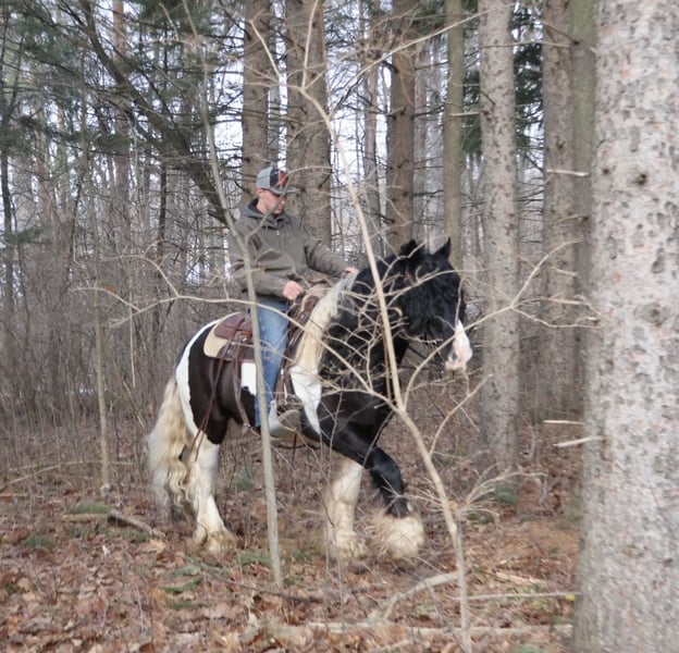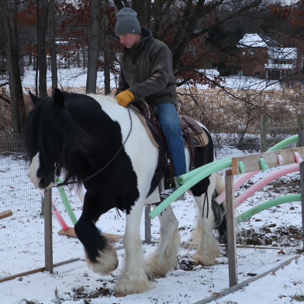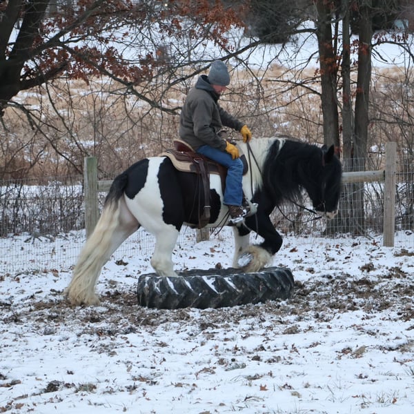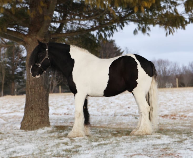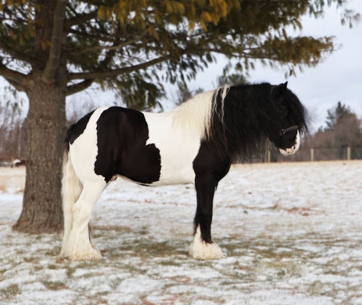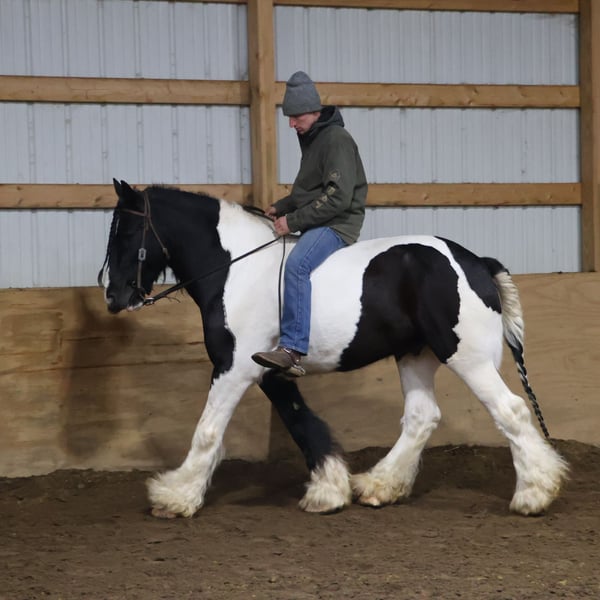 ♦️𝐍𝐄𝐖 𝐘𝐄𝐀𝐑'𝐒 𝑬𝒙𝒕𝒓𝒂𝒗𝒂𝒈𝒂𝒏𝒛𝒂♦️ Happening now thru MONDAY | JANUARY 12th - Available EXCLUSIVELY on HorseBid's website! For more details and to register visit: www.Horsebid.com CONSIGNOR CONTACT: Blackstone Stables 248-390-6831 LOCATION: Howell, MI BREED: Gypsy Vanner REGISTERED: No REGISTERED NAME: Pudge COLOR: Black and White Paint HEIGHT: 15.1 AGE: 10 GENDER: Gelding He's checking in at a solid made 15.1hh. He's a stunning black and white 12 year old gypsy vanner gelding. We are happy to introduce "Titanium's Pride" or pudge as we call him at home. His round figure and puppy dog demeanor are how he's earned his name. He has seen many miles on the trails from AZ to OR to MI and has proven himself to be a trustworthy trailblazer. Pudge has he’s got hair for days - a forelock that falls past his nose, a thick and naturally wavey mane that falls past his shoulders, a perfect tail that hits the ground and perfect feathering on all 4 legs. He looks like a picture in a magazine. His looks and conformation are no suprise as he has Tieg, The Lion King and The lion Queen on his papers. We are selling him as grade as he came with just a photo copy of his bloodlines. We have included a few baby photos of him 🙂. We are working on obtaining the original paperwork. Pudge is as kind-hearted as he is eye-catching. He truly loves his people, always the first to meet you at the gate and the last to leave your side — a true puppy-dog type. Gentle, mannerly, and calm whether you’re on the ground or in the saddle, he’s the kind you can trust every single ride. Ride him western, English, or bareback — he’s as comfortable as your living room couch and always a pleasure to ride. Pudge is steady, no-nonsense, and endlessly reliable. He’s spent time on a large working ranch checking fences, gathering cattle, and ponying colts. He has seen the rocky Arizona mountains, the deep woods of Michigan and the trails of Oregon. He will cross water, bridges, brush and ride down main roads. He is not one to notice wildlife, from elk, deer, coyotes, and birds he will remain as steady as they come. Pudge will ride out alone with plenty of confidence but will also join others in a group. Pudge has been in parades, carried the flag and has been to town. He is noticed wherever you take him and will gladly accept attention from anyone who wants to say hi. In the arena he is smooth and steady. He has 3 solid gaits, effortless transitions while being more whoa than go. He will steep right into the canter and take both leads. He also has beautiful flying changes! Pudge will stand anywhere you ask him for mounting dismounting or just in general. He is great for clipping, bathing, grooming and tacking. He's the type that can sit I the pasture and go to work once a month or every day with out issues. Pudge has been jumping around and he is fantastic at it! He's very brave to the jumps. He loads and hauls like a pro! He can live in or out and will play well with his equine buddies!Whether you’re looking for a dependable ranch horse, a safe and comfortable trail partner, a hunter type or simply a best friend Pudge is your guy.