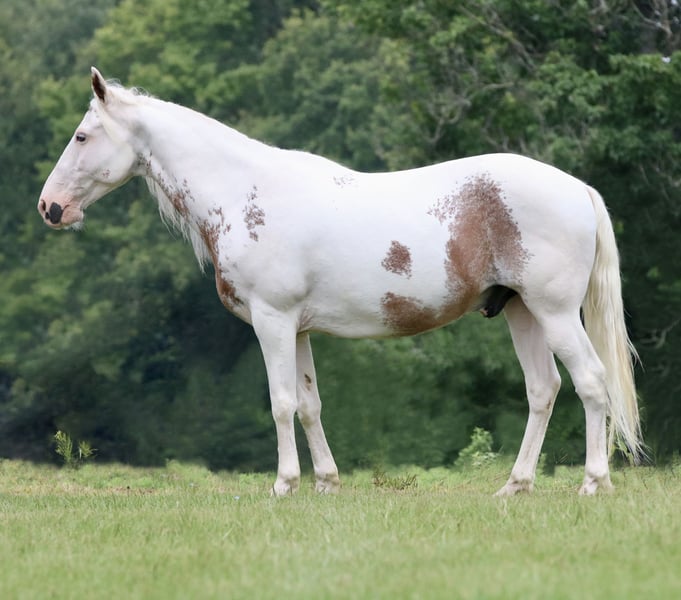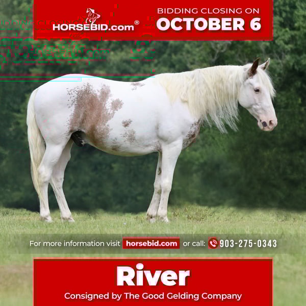 🍂 𝓐𝓾𝓽𝓾𝓶𝓷 𝑨𝑳𝑳 𝑺𝑻𝑨𝑹 𝑳𝑰𝑵𝑬𝑼𝑷 🍂 Happening now thru MONDAY | OCTOBER 6th - Available EXCLUSIVELY on HorseBid's website! For more details and to register visit: www.Horsebid.com CONSIGNOR CONTACT: The Good Gelding Company 903-275-0343 LOCATION: Athens TX BREED: Gypsy Cross REGISTERED: Yes REGISTERED NAME: River COLOR: Chestnut sabino HEIGHT: 14.1 AGE: 12 GENDER: Gelding Meet River, a striking 12-year-old Gypsy cross gelding, registered with Equines of America, standing a sturdy 14.1 hands. Compact but perfectly proportioned, River carries riders of all sizes with ease—yes, even 6-foot riders look right at home on him! River is the ultimate all-around partner. From the rugged Appalachian Mountains to city streets, parades, and every trail in between, nothing fazes him. Bridges, stairs, livestock encounters—even deer, turkeys, and the occasional bear—River stays calm, confident, and curious. At the farm, he’s completely at ease around pigs, llamas, chickens, sheep, cattle, and even a zedonk! River moves beautifully and would make a delightful western dressage mount. He’s started over cross rails, enjoys jumping, and is gentle enough for beginners or children—perfect for lesson programs. His soft neck rein and one-handed walk and trot make riding effortless. At the canter, experienced riders can maintain a one-handed seat when keeping him between the legs. River is friendly, personable, and easy-going. He enjoys attention, comes willingly from the pasture, and is well-mannered, and free of stall vices. An easy keeper, he maintains condition on hay alone and gets along with all other horses. Fully up-to-date on dental, farrier, and routine care. River isn’t just a horse—he’s a versatile, confident, and flashy partner who will make every ride an adventure, whether it’s exploring new trails, enjoying arena work, or turning heads in a parade.