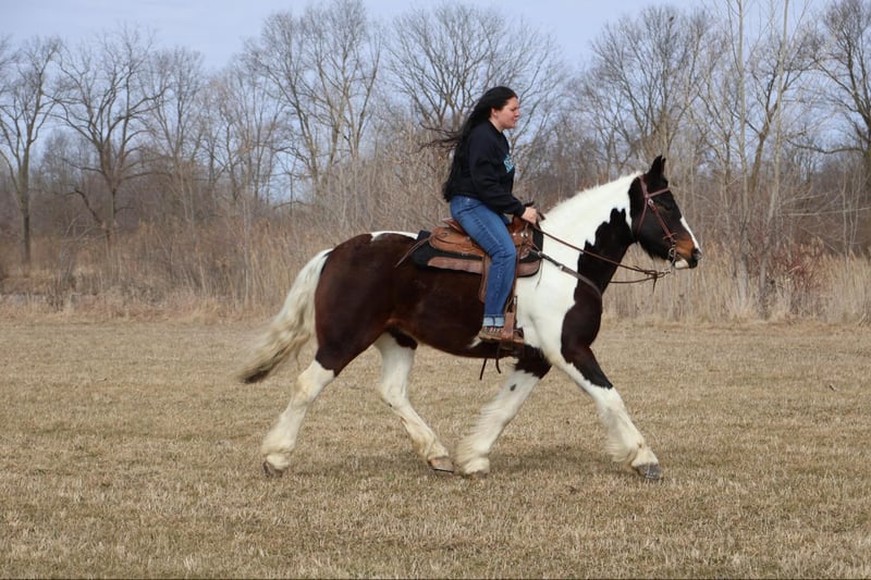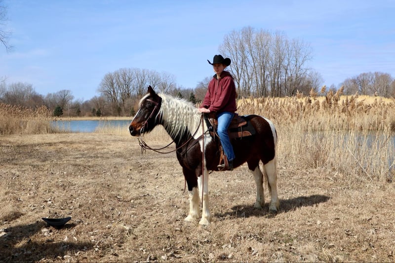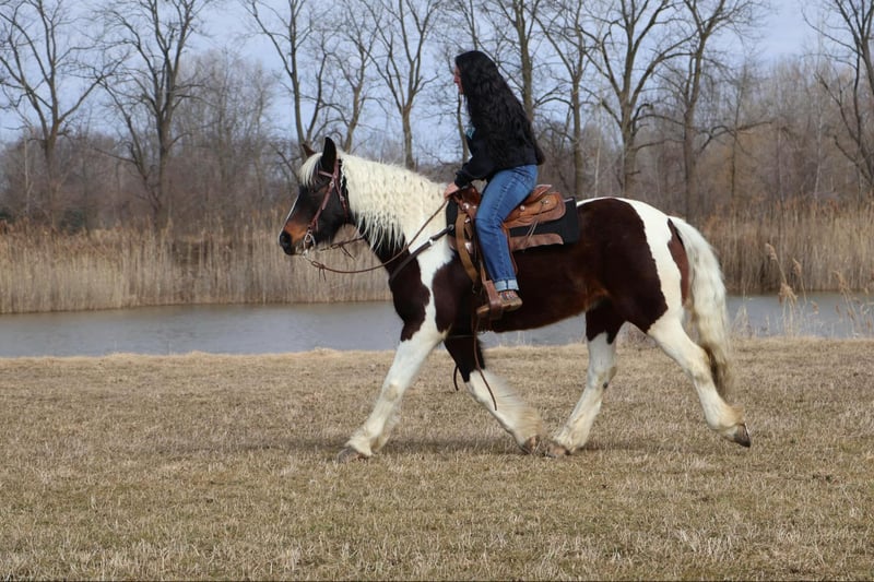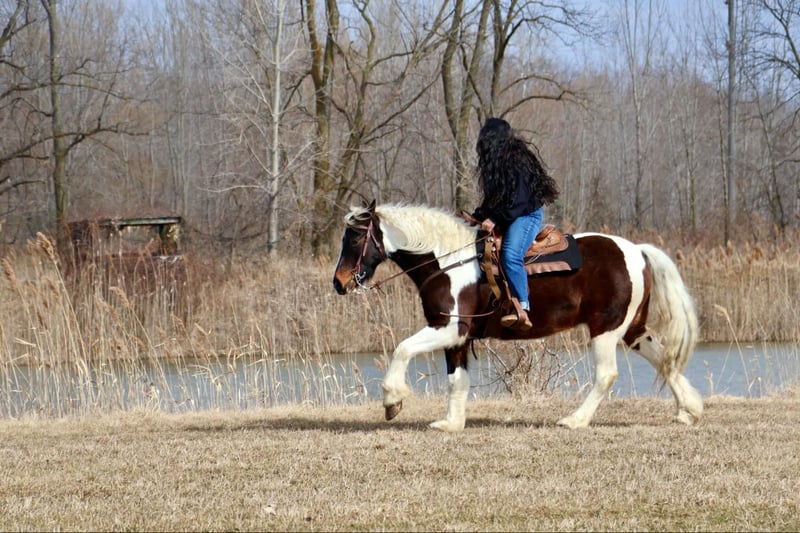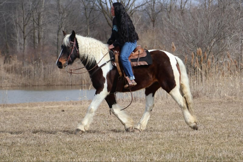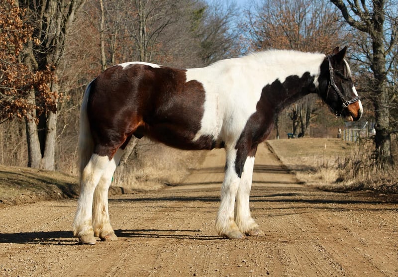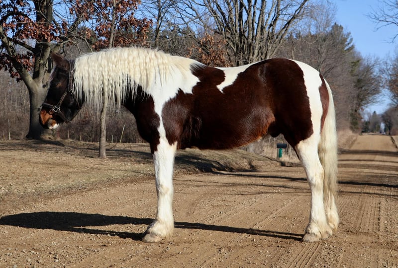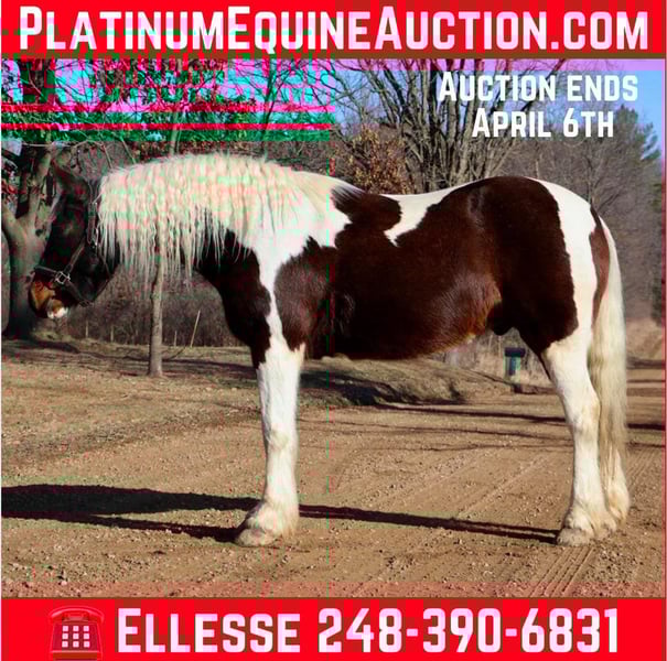 ONLINE AUCTION Place your bids at www.PlatinumEquineAuction.com Starting Bid $3500 Auction ends April 6th, 2025 Need a new saddle? Check out White Rock Saddles on our website or Facebook! He is an all-around, user-friendly, happy-go-lucky kind of guy! This boy is nothing short of spectacular. Hes a beautiful tri colored paint gypsy vanner cross with a snow white mane and tail! He stands a solid 15.2 at 12 years old. He has great bone structure and solid hooves. This gelding is put together beautifully. Patch is one of the most docile guys you will meet. He will stand tied anywhere you want to tie him for grooming, pampering, and just to be loved on. He loves a good bath and will stand and let you blow dry and braid his beautiful white mane tail and feathers. Patch has been used for tons of trail rides as he loves adventures. Patch has been hauled all over the Midwest and is no stranger to woods, water, wildlife, traffic, cyclists and any other obstacle you may come across on a trail. He’s been ridden out in the field and down the road. He’s more of a slow and steady kind of guy who will take his time soaking in the scenery. He loves teaching kids and beginners as he’s just got a very calm and kind demeanor. He has been used in kids camp doing arena work. He will walk, trot, canter, and take both leads. He also has great flying changes. He comes equipped with stellar gaits, as he’s one of the most comfortable horses you will ever sit on. He will stop on a dime and stand patiently. He has been ridden by up to 3 kids at once and has no problem. He also jumps around and dose so in great form! He’s the ultimate family horse as he’s big enough to carry a full-size adult or several children all at once but yet he’s kind enough to take care of some of the tiniest riders. He’s a confidence building type of guy. Patch lives outside with other horses and he plays very well with them. When you walk outside he’s always one of the first to greet you at the pasture gate. He’s a very easy keeper. Patch has been in several parades, he has even carried a flag. Commotion and loud noises don’t phase him a bit. He has completed our desensitization training with flying colors! He is also broke to drive and will do so single or double. He’s been down the road, and in the field! Patch has endless possibilities. He could be a best friend for any family. He could fox hunt, play in pony club, cart classes, show in any laid back discipline such as equitation, showmanship, trail, obstacle, or even a hunter under-saddle. He is correct in every way and has a demeanor to match. Patch lives in Howell, Michigan 48855 please give Ellesse Schwartz a call or text 248-390-6831 ONLINE AUCTION Place your bids at www.PlatinumEquineAuction.com Starting Bid $3500 Auction ends April 6th, 2025 Need a new saddle? Check out White Rock Saddles on our website or Facebook!