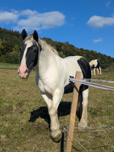 For sale is our Tinker gelding. Sting is 15 years old and perfect for anyone looking for a reliable leisure horse. He is equally comfortable hacking alone or in a group, and small dressage exercises and jumps are no problem. Even if Sting gets spooked, he remains manageable at all times. He is familiar with box stall, open stall, and pasture turnout, and has had no issues in any of these management systems. He is shod in front and barefoot behind. Additionally, Sting is a summer eczema sufferer. He would also make an excellent school horse. For serious inquiries, please contact the number below. A trial ride can be arranged for a fee.