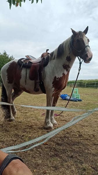 Le joli hongre croisé Tinker, Berry, cherche un foyer approprié. Le pie brun a 15 ans. - Travail au sol - Longes - Travail libre - Promenades dans la nature - Débourré - Taille au garrot 1,60 m - Très sociable, rang moyen - Amical avec les chiens - Pas impressionné par les tracteurs, etc. - Bien ferré - Habitué au transport - Vacciné - Vermifugé régulièrement - Très attentif, apprenant vite et concentré - Motivé, engagé - Réagit très bien aux subtilités et aux signaux - Actuellement non monté - Élevé en stabulation libre - Connaît les petits et grands troupeaux - Rapport de santé 2024 disponible Diagnostic d'asthme équin en 2023, la gestion a été immédiatement optimisée, depuis il est sans symptômes. Il reçoit de l'enrubannage. Berry est en bonne santé et en pleine forme ! Berry a été monté modérément ces dernières années, jusqu'à l'automne 2024. Chez nous, il n'est pas monté, mon fils s'est assis de temps en temps sur lui, et il se laisse très bien travailler au sol. Il n'y a pas vraiment d'harmonie entre nous, c'est pourquoi nous nous séparons. Bien sûr, il sera donné uniquement à de bonnes mains. Un bon foyer avant le prix !