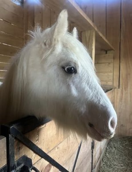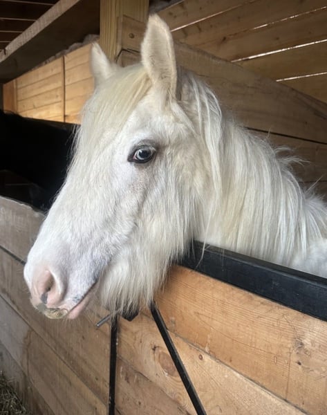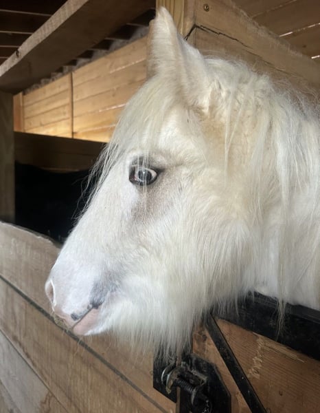 Hermoso palomino sabino con un ojo azul y una presencia imponente