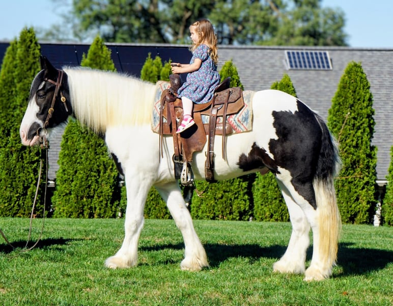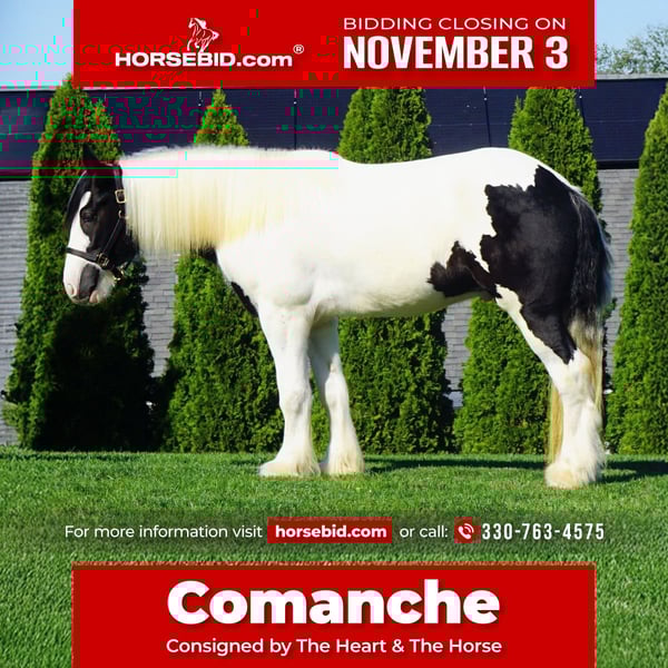 ⚜️𝐓𝐇𝐄 𝐅𝐀𝐋𝐋 𝐇𝐄𝐑𝐈𝐓𝐀𝐆𝐄 𝐂𝐋𝐀𝐒𝐒𝐈𝐂⚜️ Happening now thru MONDAY | NOVEMBER 3rd - Available EXCLUSIVELY on HorseBid's website! For more details and to register visit: www.Horsebid.com CONSIGNOR CONTACT: The Heart & The Horse 330-763-4575 LOCATION: Urichsville OH BREED: Gypsy Vanner REGISTERED: Yes REGISTERED NAME: Silhouette Farms Commissars Comanche COLOR: Black & White HEIGHT: 15.2 AGE: 3 GENDER: Gelding Everyone meet Comanche. Comanche is a 3 year old gypsy gelding, standing approx 15.2 hands. Comanche has been started under saddle around 90 days, and has a great foundation, both on the ground and under saddle. He has a very sweet, laid back disposition, making him an exeptionanl individual to be around. He has had time riding in the arena, learning to soften to pressure, and building a great foundation on his WTC. He has been ridden on the road, and exposed to traffic, and does great with obstacles. If your looking for a gypsy gelding with a great foundation, and disposition Comanche might just be they guy for you. If you have any questions feel free to reach out.