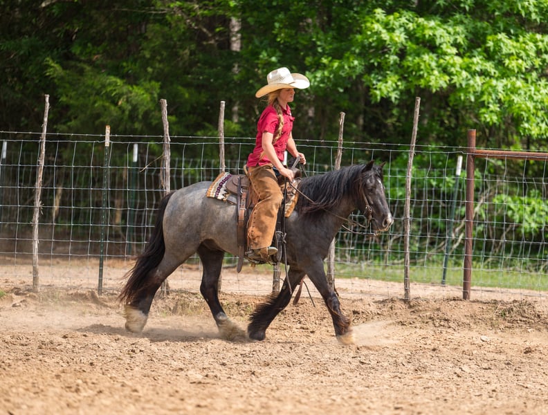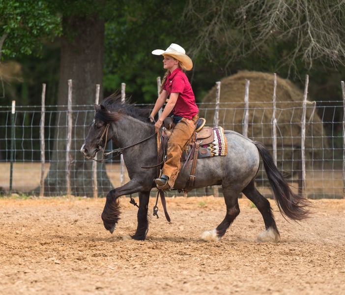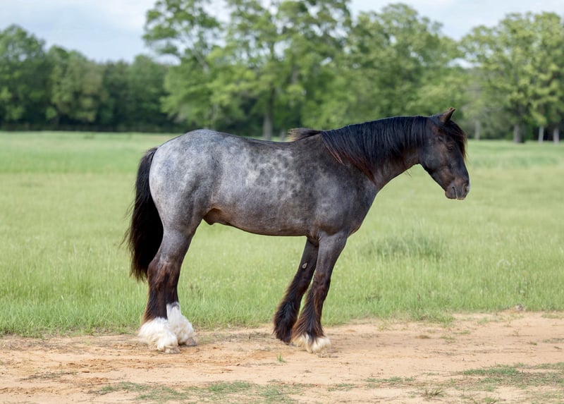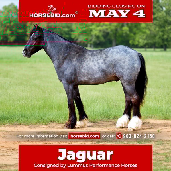 ▪️▫️◾️𝐭𝐡𝐞 𝑴𝒂𝒚 𝐒𝐞𝐥𝐞𝐜𝐭◾️▫️▪️ Happening now thru MONDAY | MAY 4th - Available EXCLUSIVELY on HorseBid's website! For more details and to register visit: www.Horsebid.com CONSIGNOR CONTACT: Lummus Performance Horses 903-824-2150 LOCATION: Bloomburg, TX BREED: Gypsy Vanner Cross REGISTERED: No COLOR: Blue Roan HEIGHT: 12.2 AGE: 4 GENDER: Gelding Jaguar is the perfect UNICORN kids pony!! He is a blue roan 4 year old half Gypsy Vanner gelding standing 12.2 hands tall with a thick, sturdy build. He is the ultimate kids’ pony and is exceptionally safe both on the ground and under saddle. Jaguar has an outstanding disposition, he loves people and is always the first to meet you in the pasture. Despite his young age, Jaguar has been extensively hauled to town and trail rides. He has truly been there and done that and handles new experiences with confidence. He is comfortable with tarps, flags, traffic, dogs, and busy town settings, including sidewalks and crowds. He hauls well and eats/drinks in new places. Jaguar has excellent ground manners. He leads, loads, ties quietly, and stands for grooming, bathing, saddling, and bridling. He is very gentle and patient. My 7 year old can catch, groom, saddle, bridle, and ride him independently, even while riding a Segway, without any issues. He is trustworthy with even the smallest riders. Under saddle, Jaguar is versatile and suitable for both Western and English. He would make an excellent short stirrup mount, as he is willing and confident to go over small jumps. He has smooth gaits and is very easy to ride, with a willing, eager-to-please attitude. He walks, trots, and lopes good circles, wants to have a sliding stop, and turns around correctly. Jaguar is a very dependable trail horse, he takes great care of his rider, even on the sketchy steep creek banks/crossings, rough country, and will NOT jump the water. He will calmly ease into and out of water without hesitation. He rides well alone or in a group and is comfortable leading or following on a loose rein. Jaguar has been used for a variety of things including trail riding, hog hunting, working cattle, and dragging logs. Dogs, goats, machinery, and other livestock do not bother him at all. He has also been hauled to rodeos, team ropings, barrel races, and into town, and is always very reliable. In the arena, Jaguar is also good inside the arena. He has been started on barrels, poles, goat tying, and breakaway, he has also been used for lead-line for the little ones! Jaguar is easy to catch on any amount of acres, he will be the first one to you! He requires no special maintenance and is easy to keep. He is up to date on farrier, deworming, and vaccinations. Jaguar is 100% sound and can stay barefoot. He truly is a special pony with an old soul. Horses like him are hard to find!