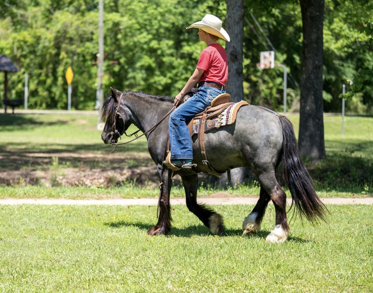 Jaguar, potro de 4 años, 12.2 hh, mezcla de Gypsy Vanner y caballo de color azul roan, castrado